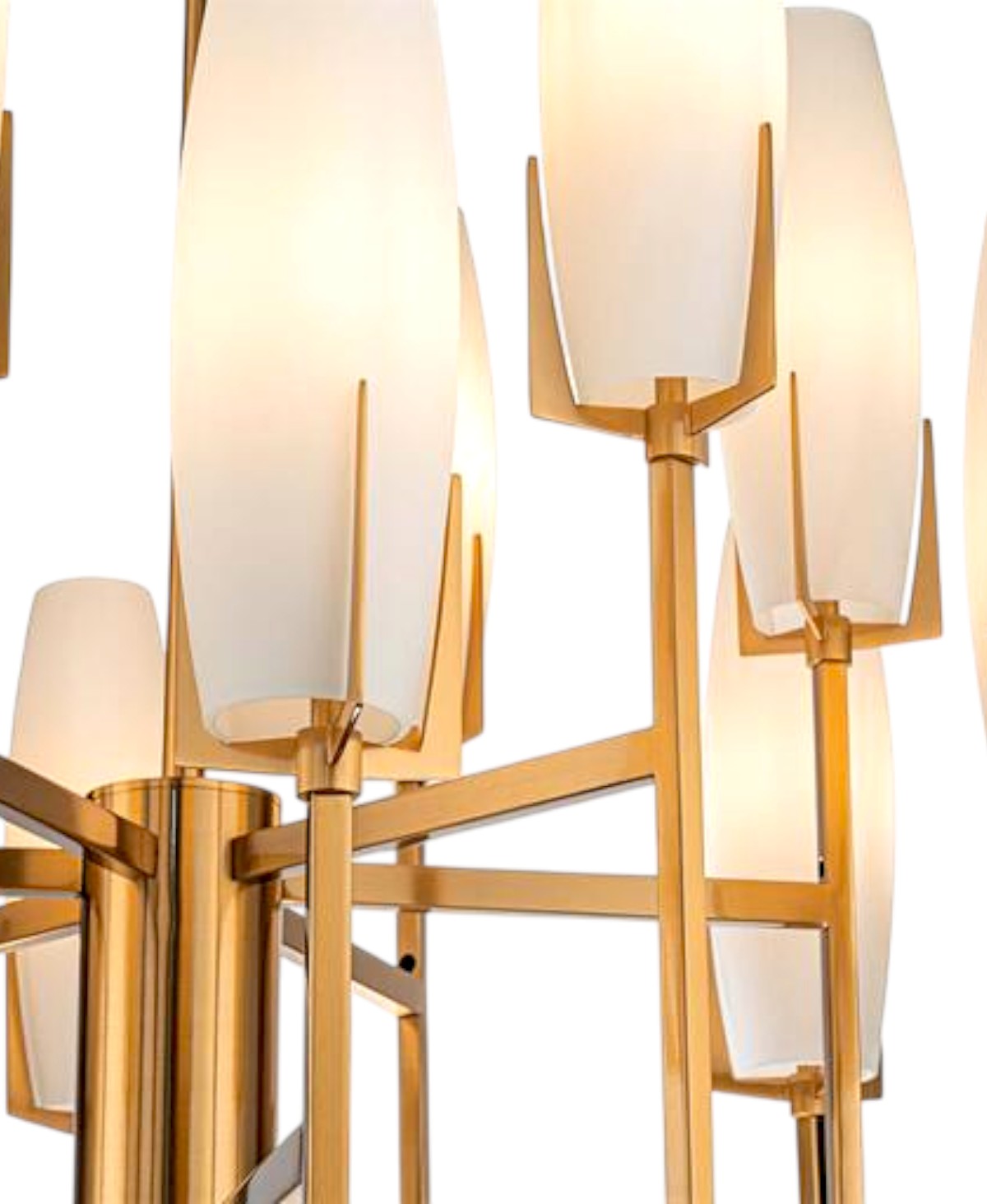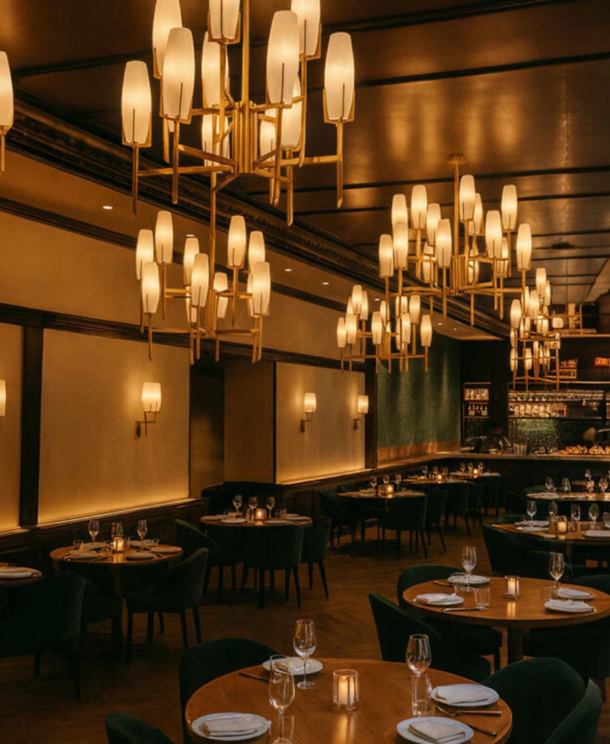 Zengin antika pirinç kaplaması, 1950'ler ve 1960'ların retro estetiğini çağrıştıran cesur geometrik bir tasarımla birleşiyor. Beyaz camdan yapılmış ve antika pirinç çerçeveyle süslenmiş koni şeklindeki mimari camlar, Orta Çağ Moderni görünümünü tamamlıyor.