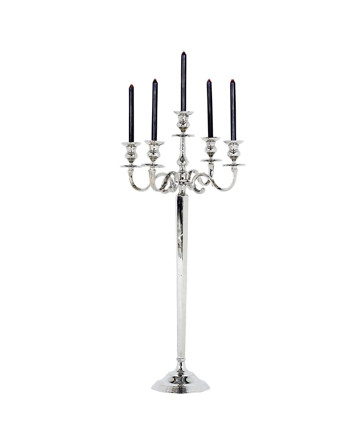 Nikel kaplamalı bu klasik beş kollu şamdan, kaydırma detayına, gözyaşı tasarımlı direğe ve dairesel bir kaide tabana sahiptir.