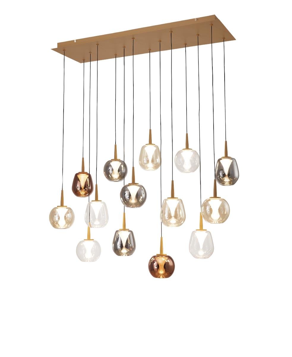 Bakır, krom, şeffaf ve bal rengi camlardan oluşan bu avize her mekana uyum sağlıyor.