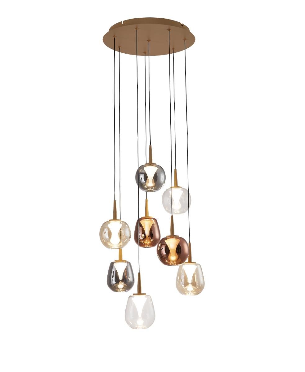 Bakır, krom, şeffaf ve bal rengi camlardan oluşan bu avize her mekana uyum sağlıyor.