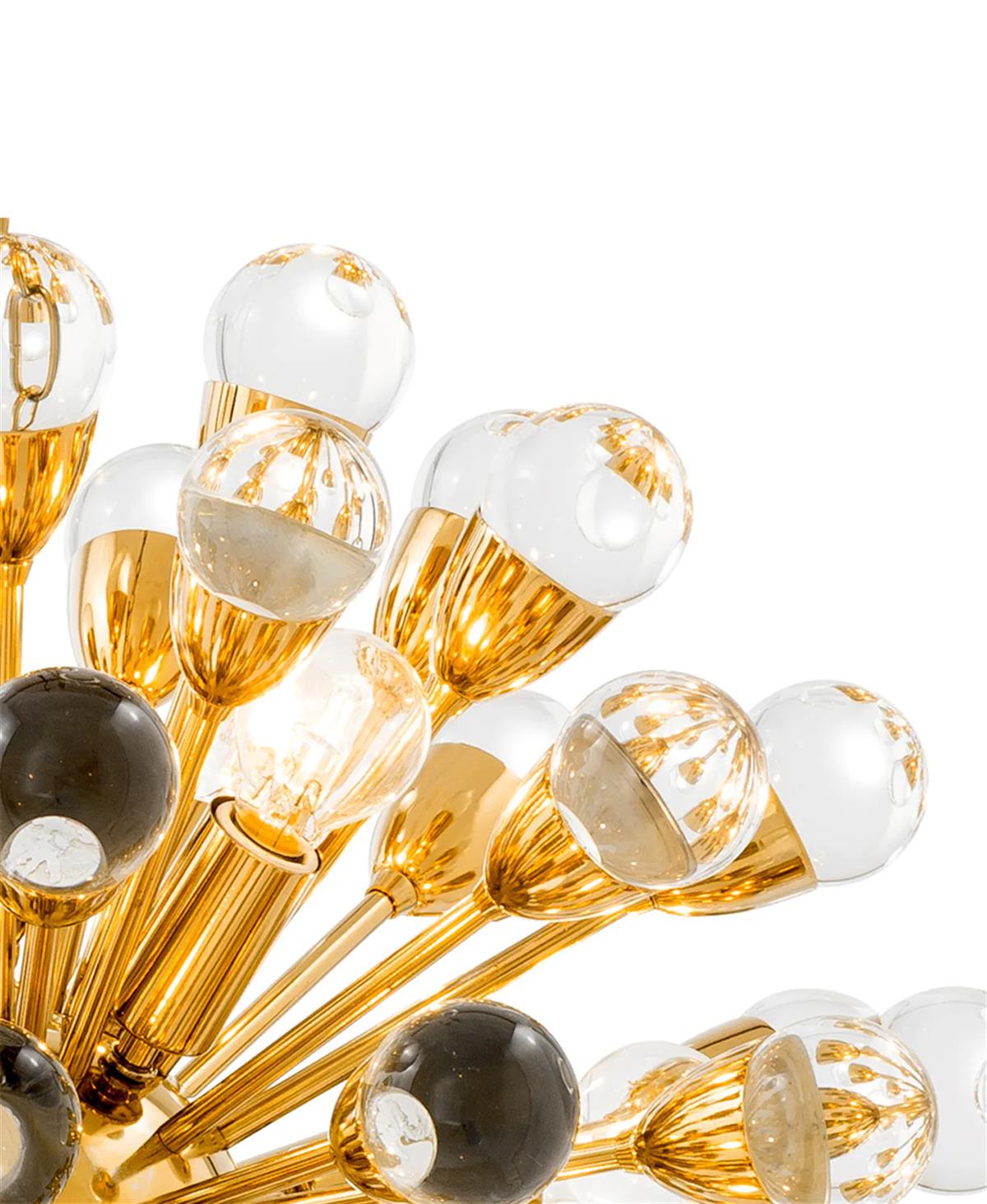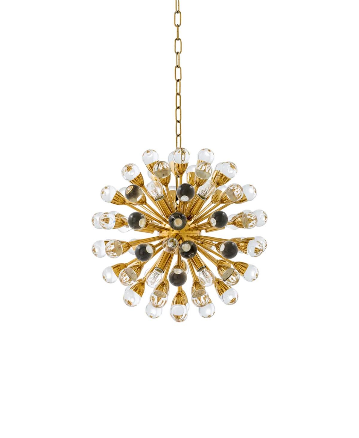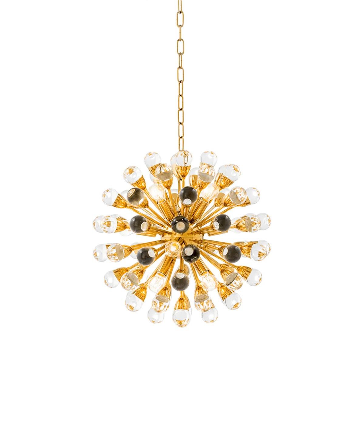 Parlak altın kaplamalı avize, küçük bir merkez küreden parlak bir şekilde yayılan on iki ışığa sahiptir.
