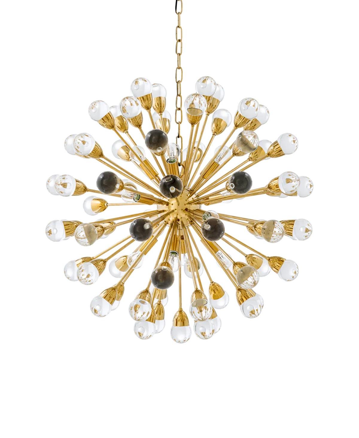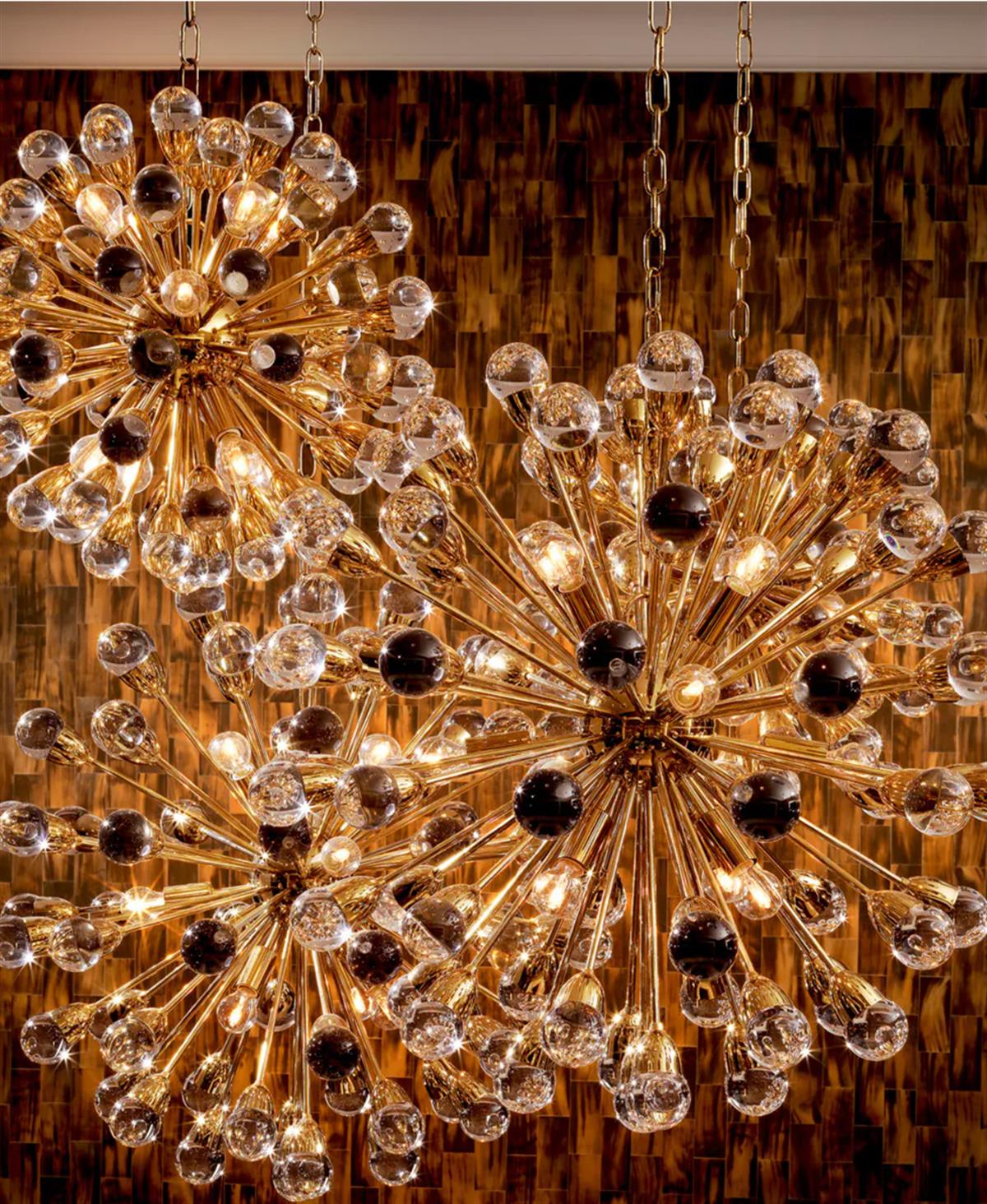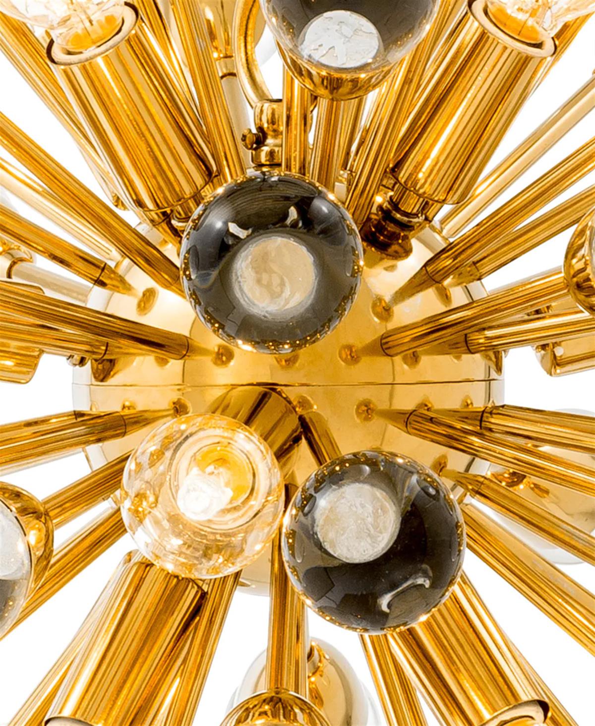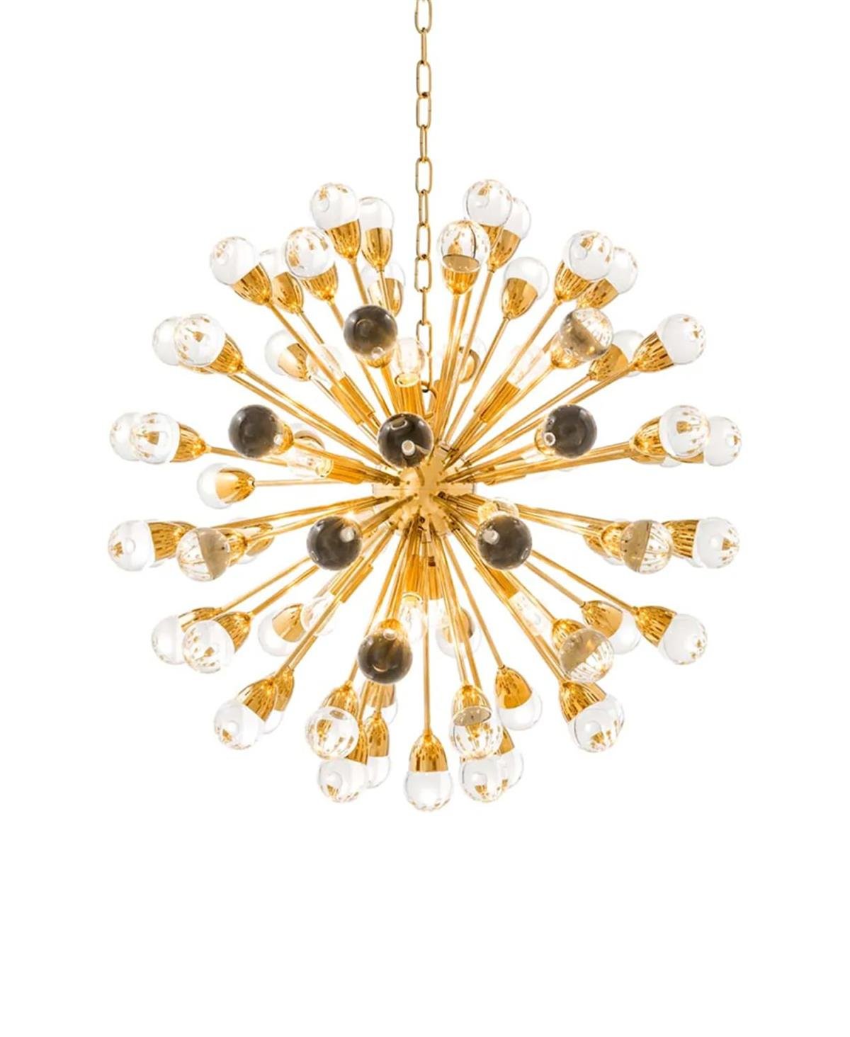 Parlak altın kaplamalı avize, küçük bir merkez küreden parlak bir şekilde yayılan on iki ışığa sahiptir.