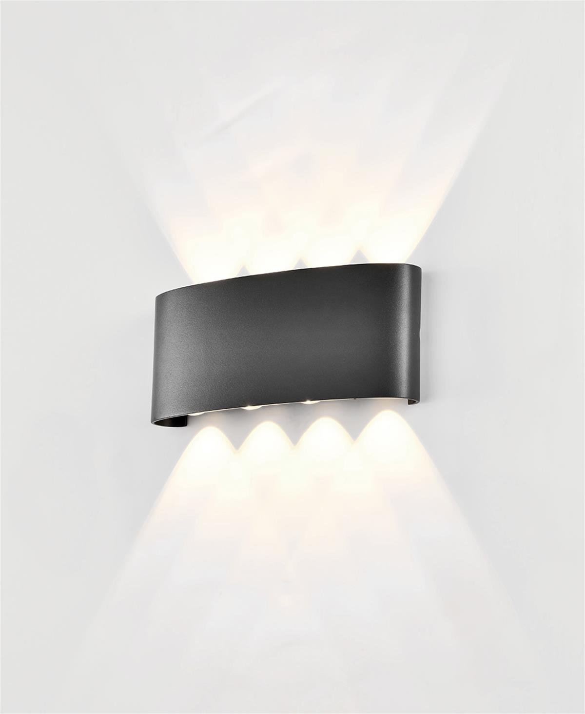 Arcs LED dış mekan duvar lambası da paslanmaz çelikten yapılmıştır ve zarif bir şekilde kendini gösterir. Işık, duvarda hem yüksekte hem de alçakta eşit olarak yansıtılır.