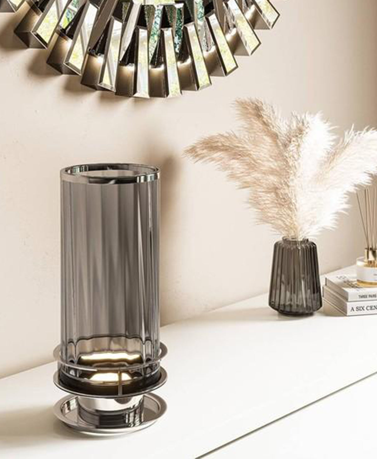 Prizmatik dokuya ve füme renk tonuna sahip üfleme cam masa lambası.