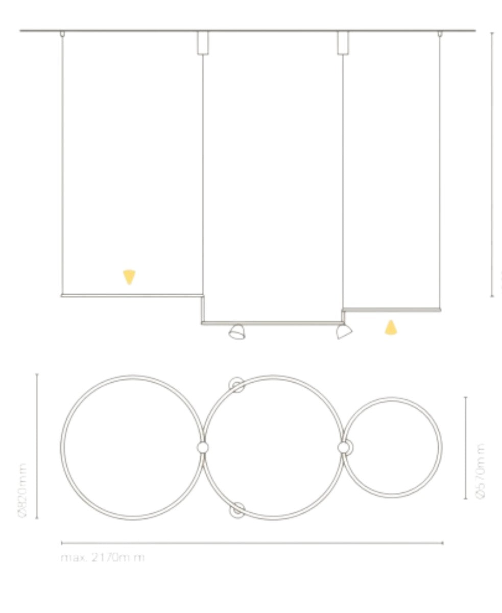 Aros Triple, oturma odasında rahat bir atmosfer yaratmak için mükemmel bir armatürdür. Birbirine bağlı üç halkadan oluşan yapısıyla doğrudan ve dolaylı ışık oluşturur. Ürünle birlikte verilen ışık kaynağı 83W (61W + 22W) CRI 80 3000K 8690lm (6830lm + 1860lm) LED'dir. IP20 koruma sınıfına ve Sınıf II yalıtıma sahiptir.
