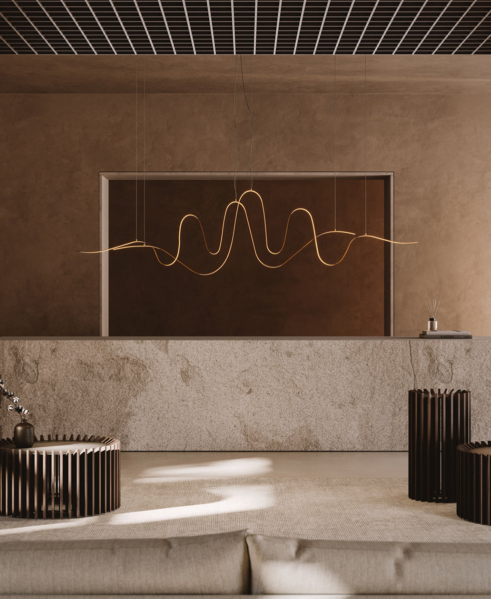 Bissa Sarkıt Lamba, ışığın uçucu niteliği ile metalin sağlamlığı arasındaki etkileşimi yakalar. Ayarlanabilir çelik kablolarla desteklenen, etkileyici bir şekilde cilalanmış pirinç bir yapıya sahiptir. Bir LED şerit, kıvrımlı hatları boyunca uzanarak havada süzülüyormuş gibi görünen bir ışık izi oluşturur.