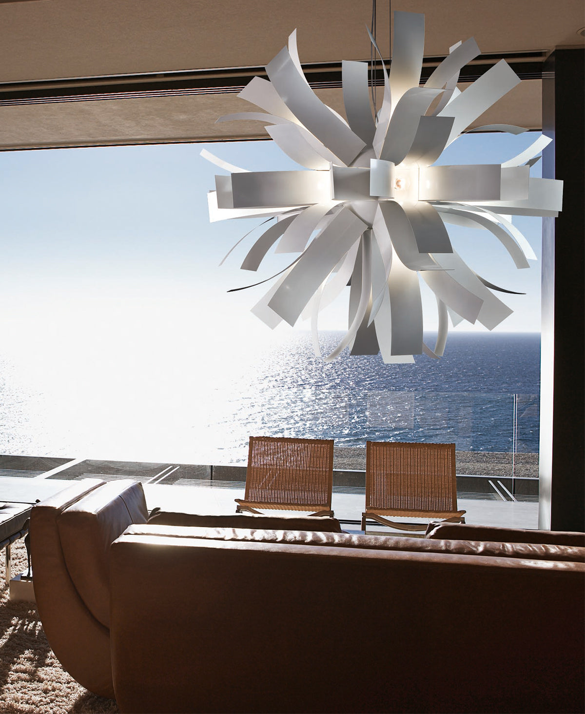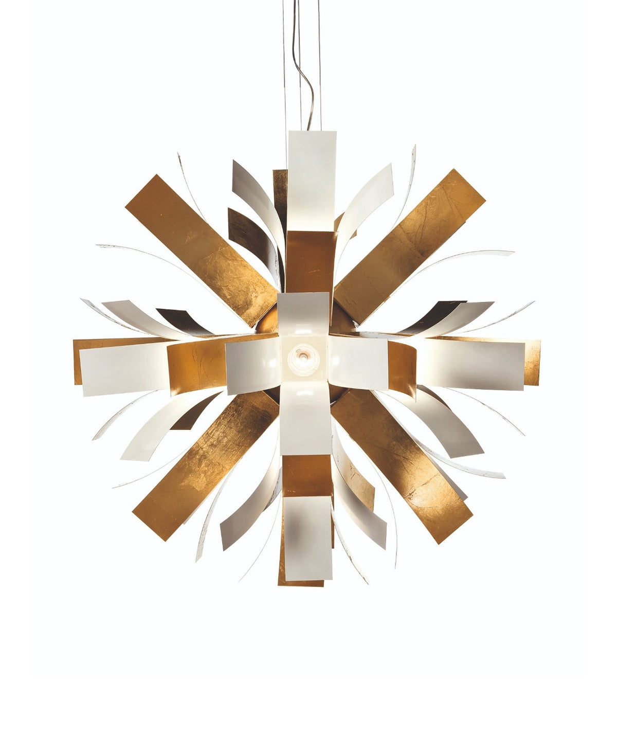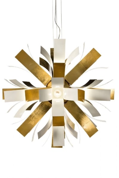 Bu basit ama karmaşık sarkıt lamba, 80 cm çapında; gümüş-altın varaklı metal yapraklardan oluşmaktadır.
