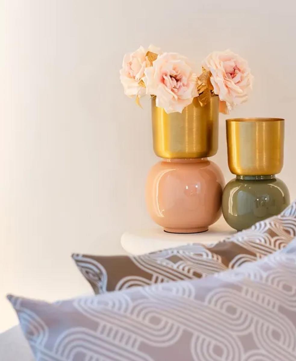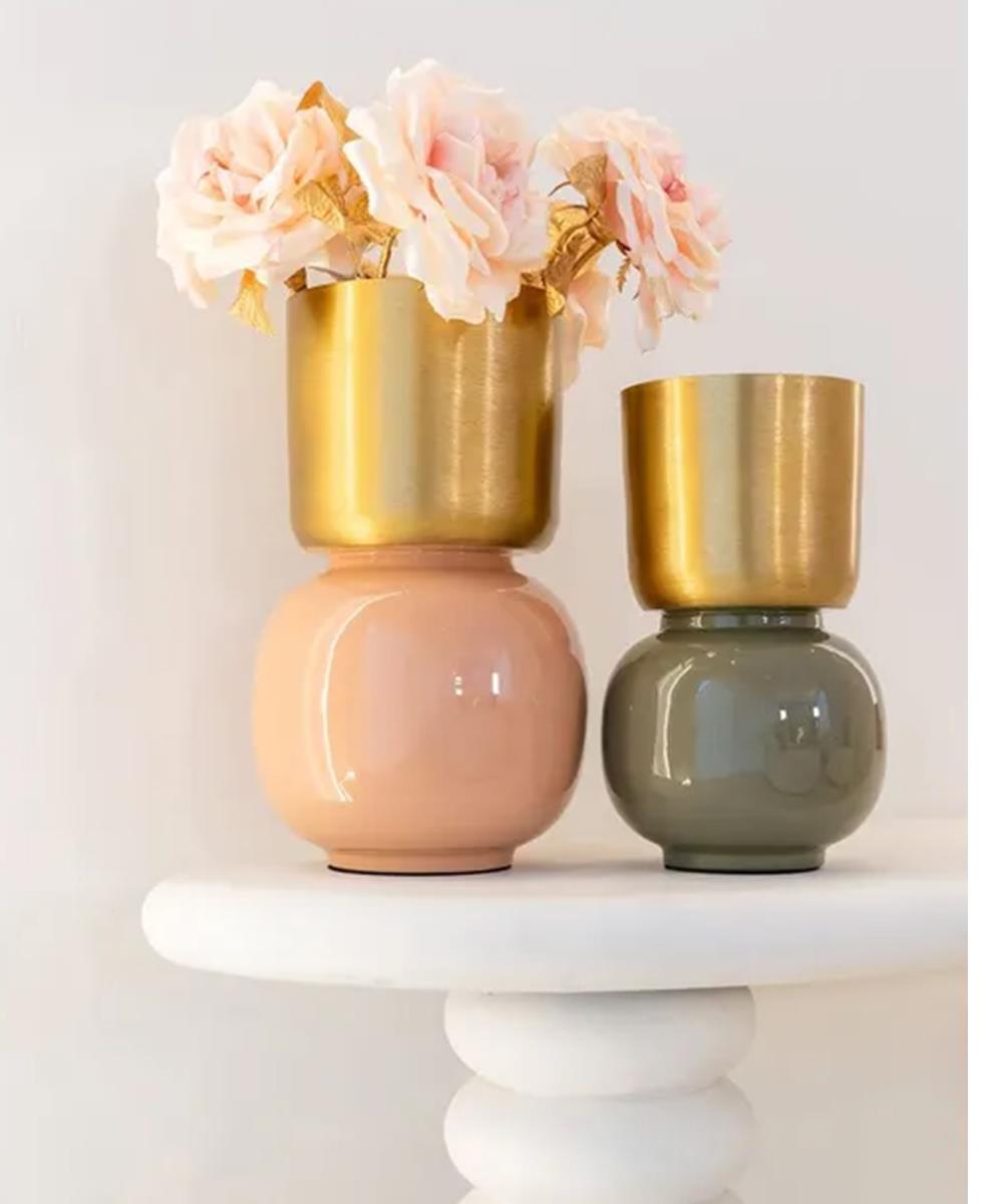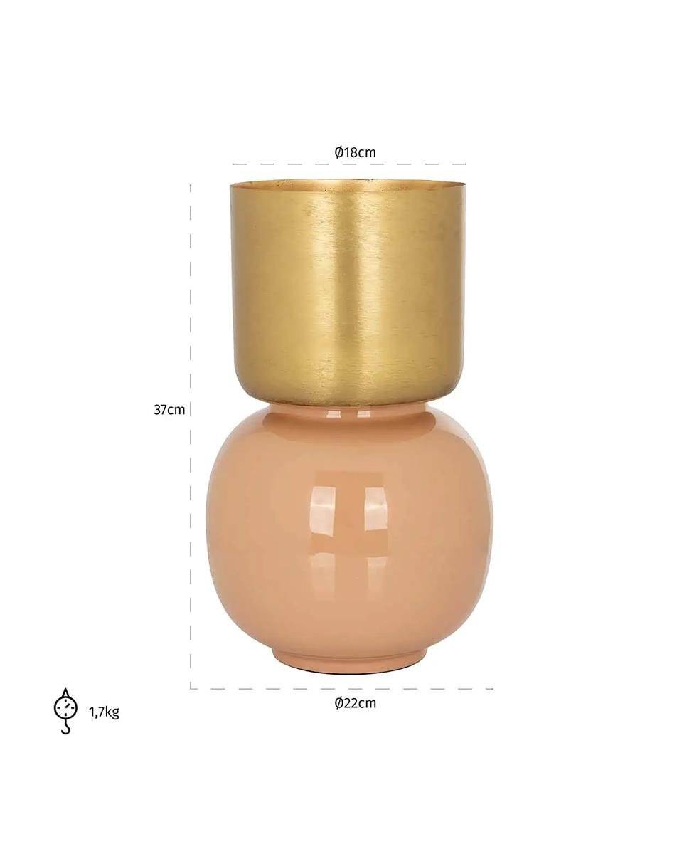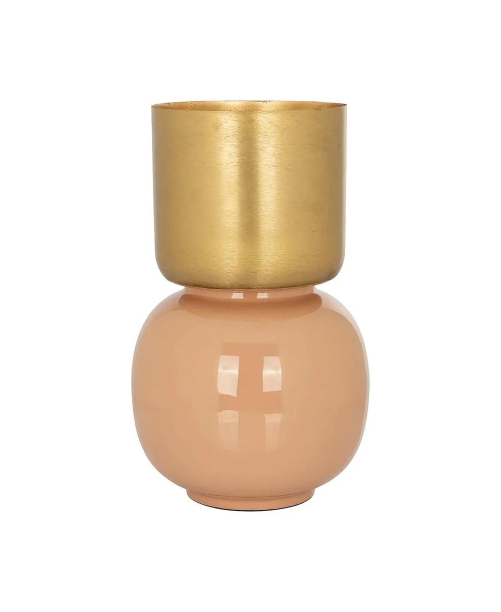 Toz pembe rengin altın rengi çelikle birleşimi vazoya romantik bir görünüm kazandırıyor.