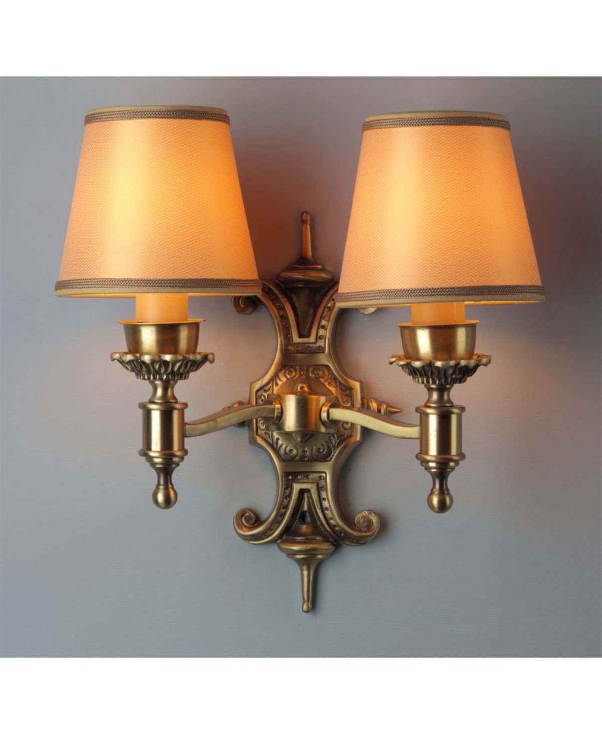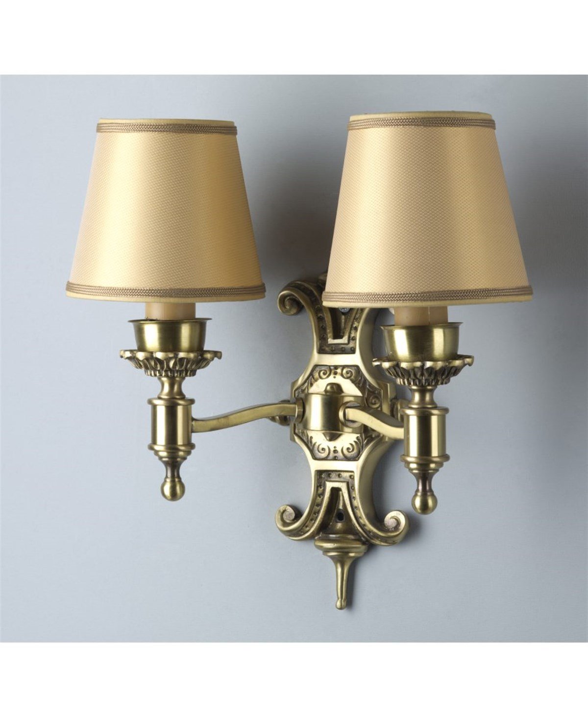 Dökme bronz üzeri eskitme pirinç/siyah patineli Genişlik: 29 cm Yükseklik: 25 cm Duvardan mesafesi: 15 cm Ampul Adedi: 2 Ampul Gücü: 2 x 40 W Ampul Türü: E14 Menşei İtalya. Fiyatlarımıza ampul dahildir.