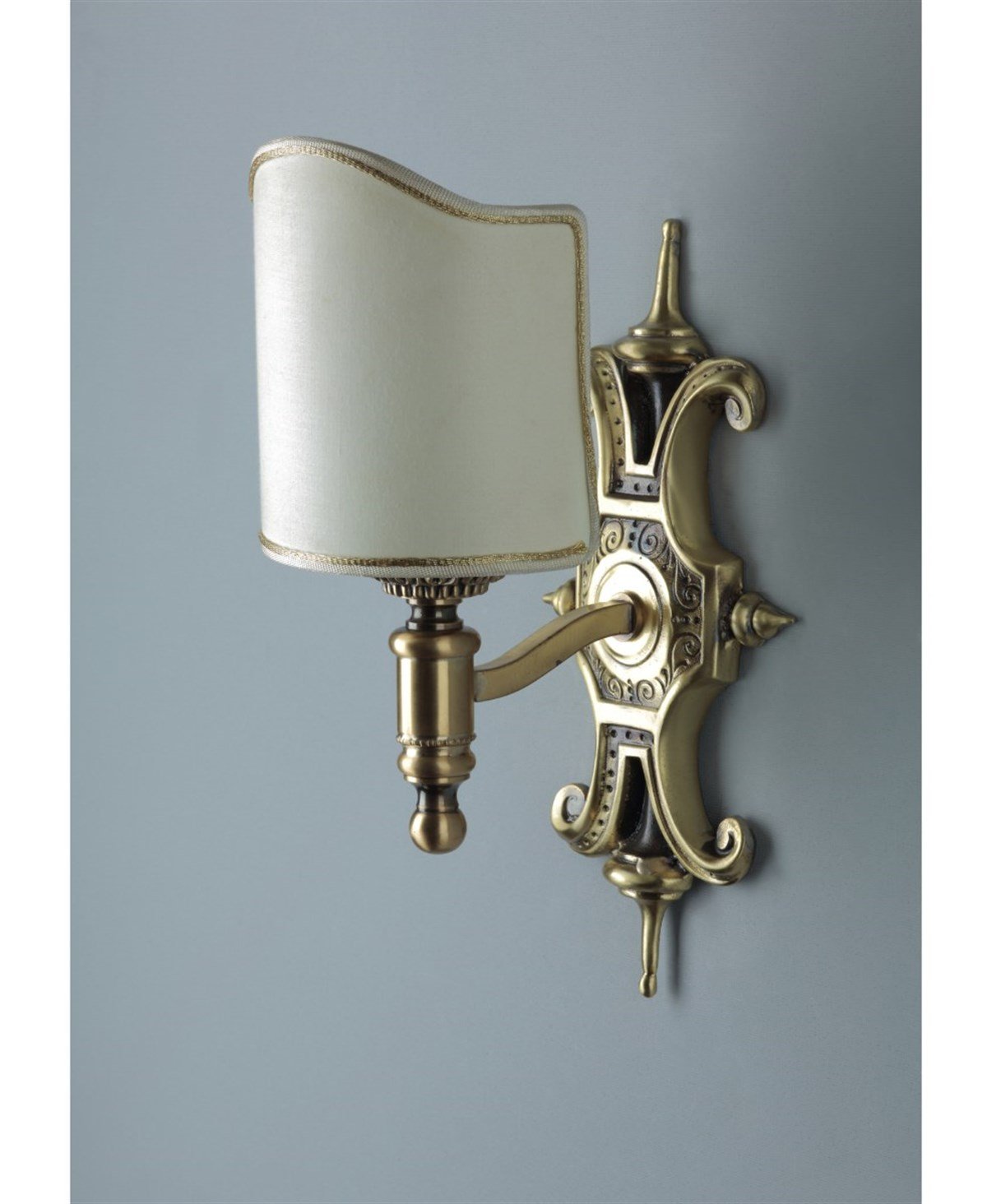 Dökme bronz üzeri eskitme pirinç/siyah patineli Genişlik: 13 cm Yükseklik: 25 cm Duvardan mesafesi: 15 cm Ampul Adedi: 1 Ampul Gücü: 40 W Ampul Türü: E14 Menşei İtalya. Fiyatlarımıza ampul dahildir.