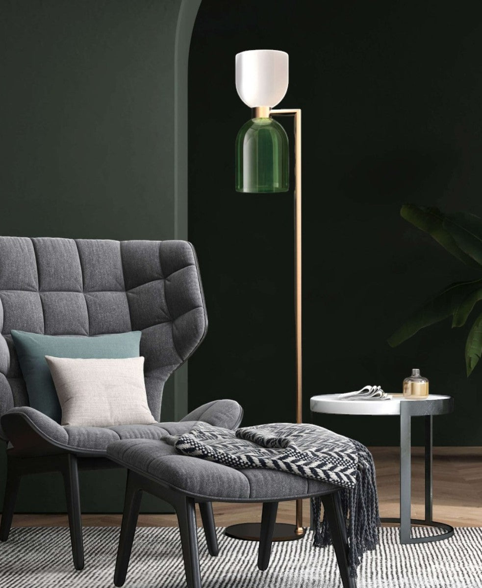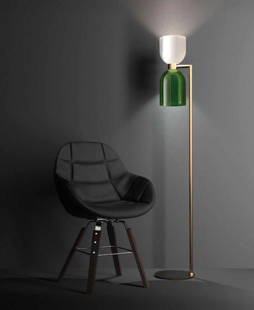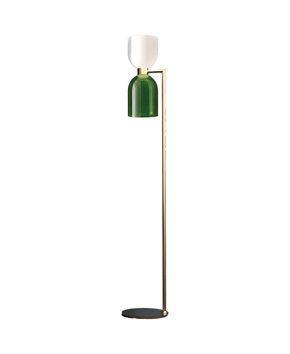 Fırçalanmış altın kaplama ve beyaz-yeşil veya beyaz-akik cam difüzörlü metal lambader.