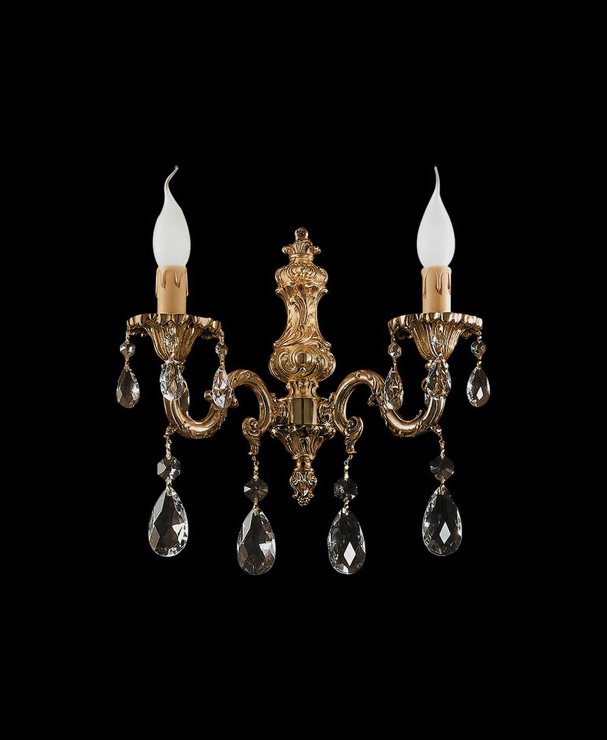 Dökme bronz malzeme üzeri altın kaplama Genişlik: 32 cm Yükseklik: 27 cm Duvardan mesafesi: 17 cm 2 x 40W E14 Menşei İtalya Fiyatlarımıza ampul dahildir.