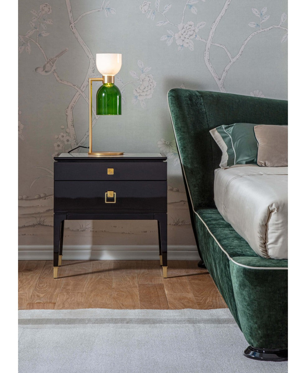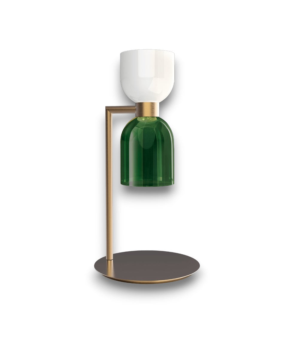 Fırçalanmış altın kaplama ve beyaz-yeşil veya beyaz-akik cam difüzörlü metal masa lambası.