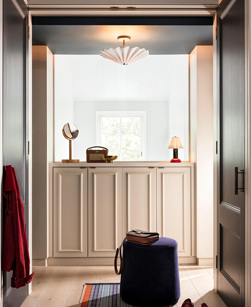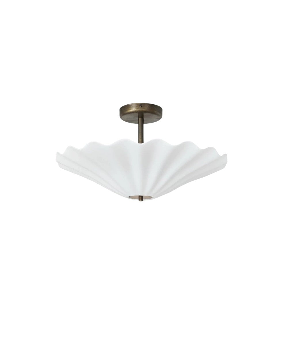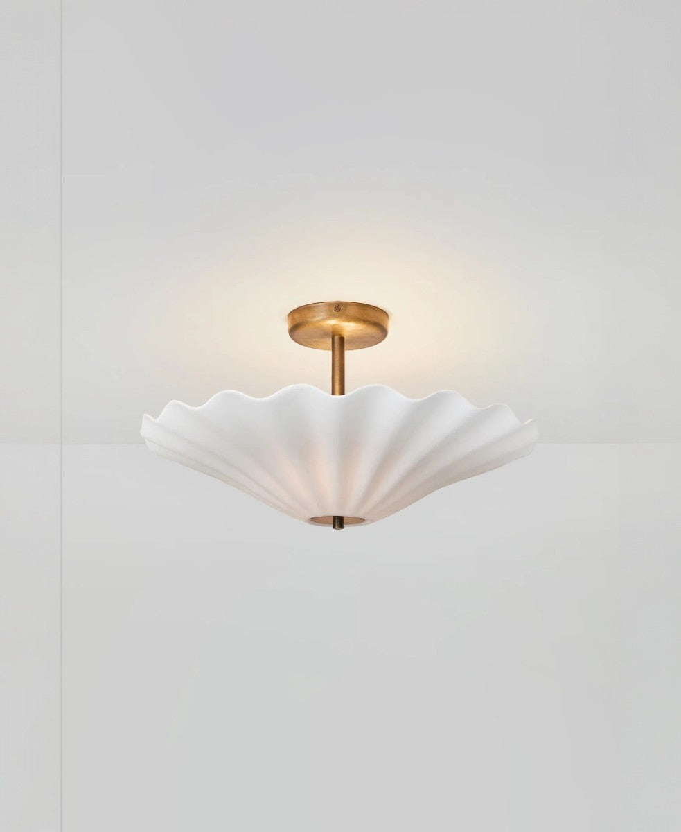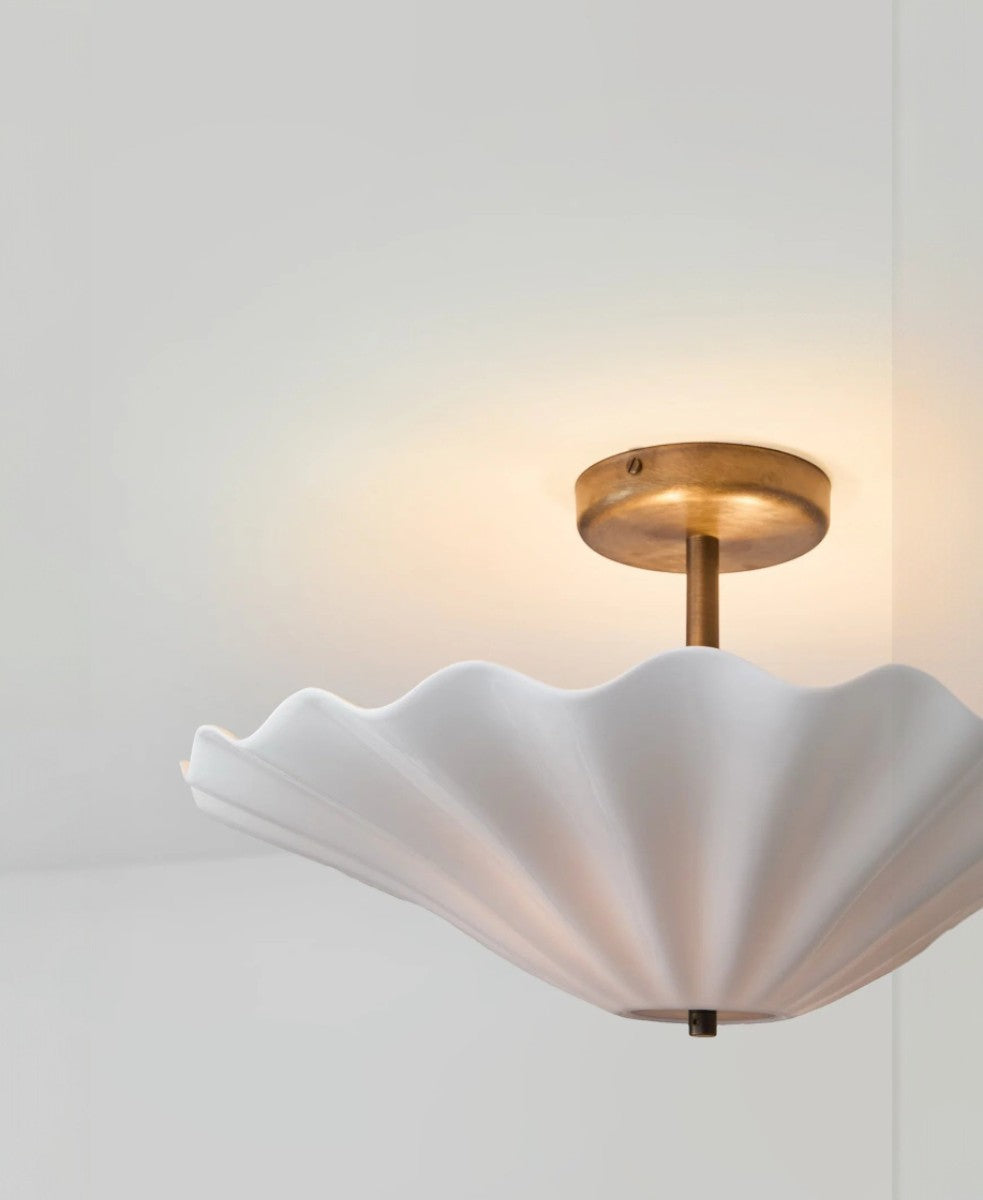 Çarpıcı Christie Tavan Lambası ile tavanlarınızı dönüştürün ve tüm odayı daha şık bir hale getirin. Temiz çizgileri ve neşeli bir havayı incelikle dengeleyen tasarımın dalgalı, parlak bone china malzemesi denizin dalgalarından ilham almıştır. Zengin antika pirinçten yapılmış bir sabitleme diski ve tepe parçasıyla tutturulan tavan lambasının iki ampulü, abajurun ışığı tavana yansıtmasıyla atmosferik dolaylı aydınlatma yaratır.