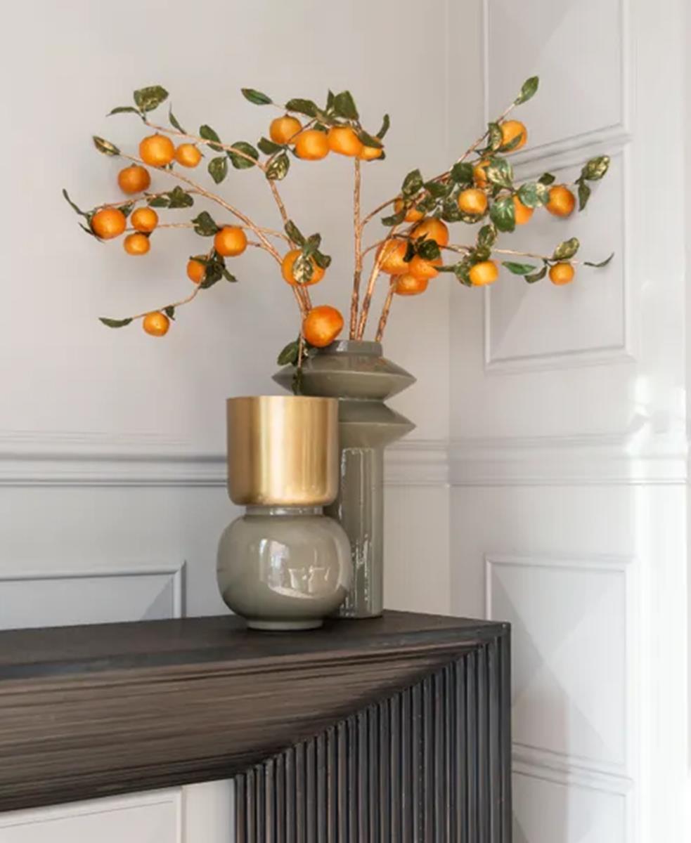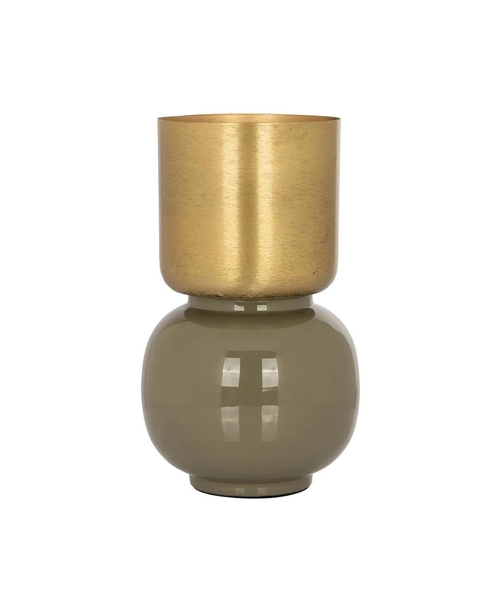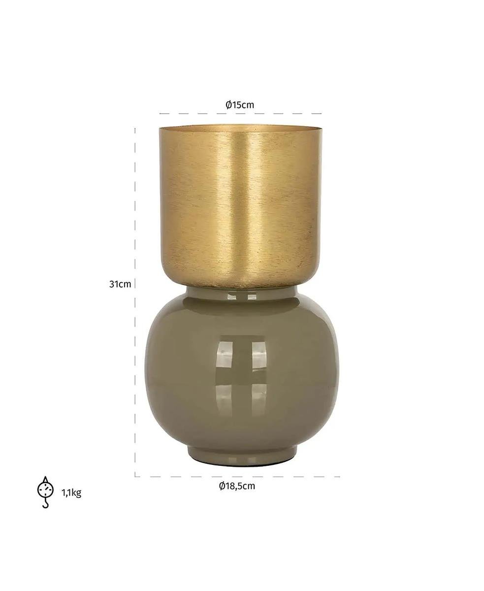 Yeşilin altın rengi çelikle birleşimi vazoya romantik bir görünüm kazandırıyor.