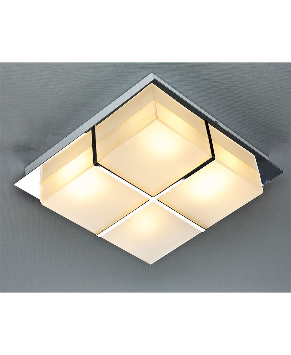 Beyaz kumlama cam Parlak krom çelik Genişlik: 38 cm x 38 cm Yükseklik: 9 cm Ampul Adedi: 4 Ampul Gücü: 4 x 20W E27 Menşei İspanya. Fiyatlarımıza ampul dahildir.