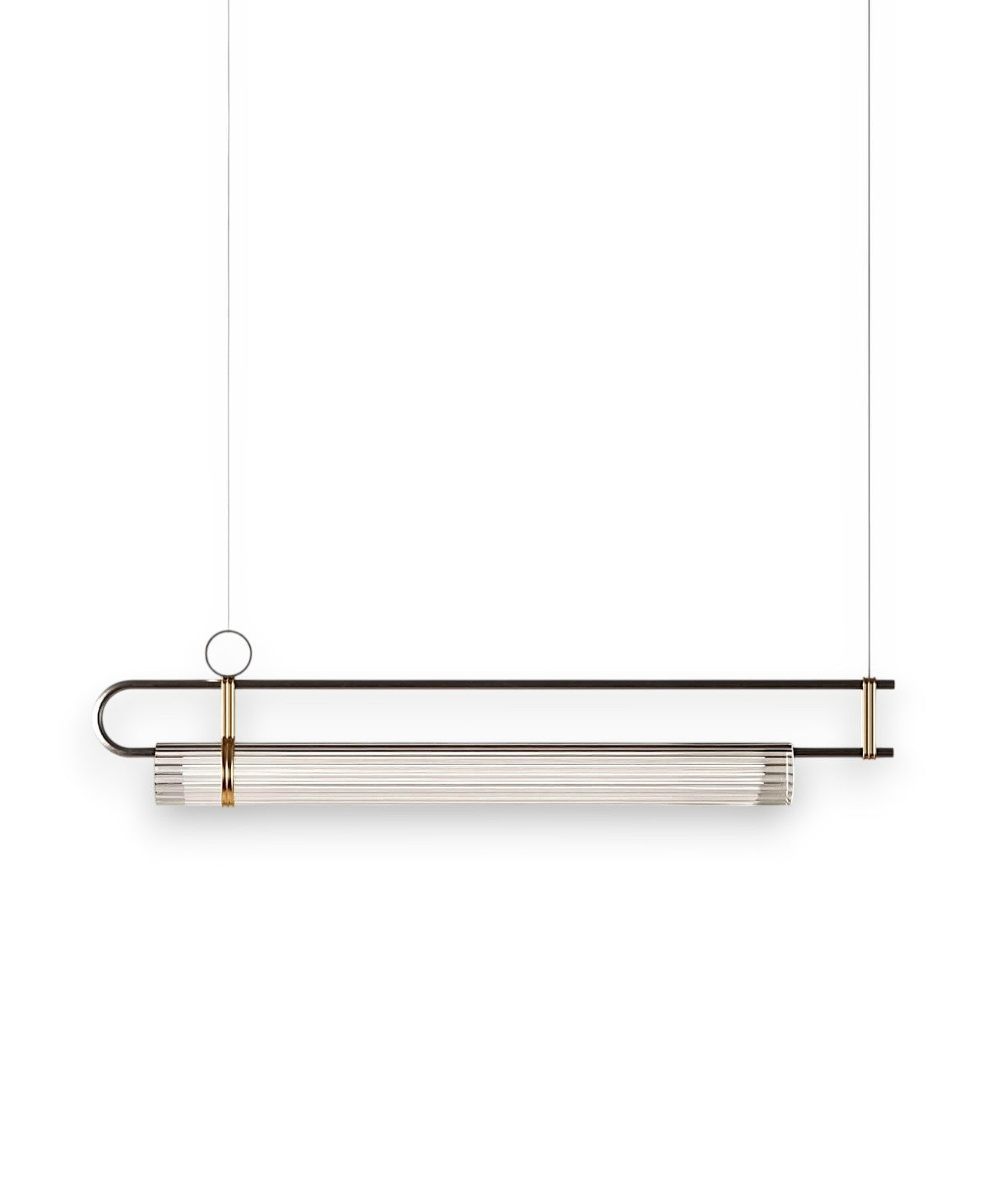 Demir grisi ve fırçalanmış açık altın detaylı metal iskeletli sarkıt lamba.