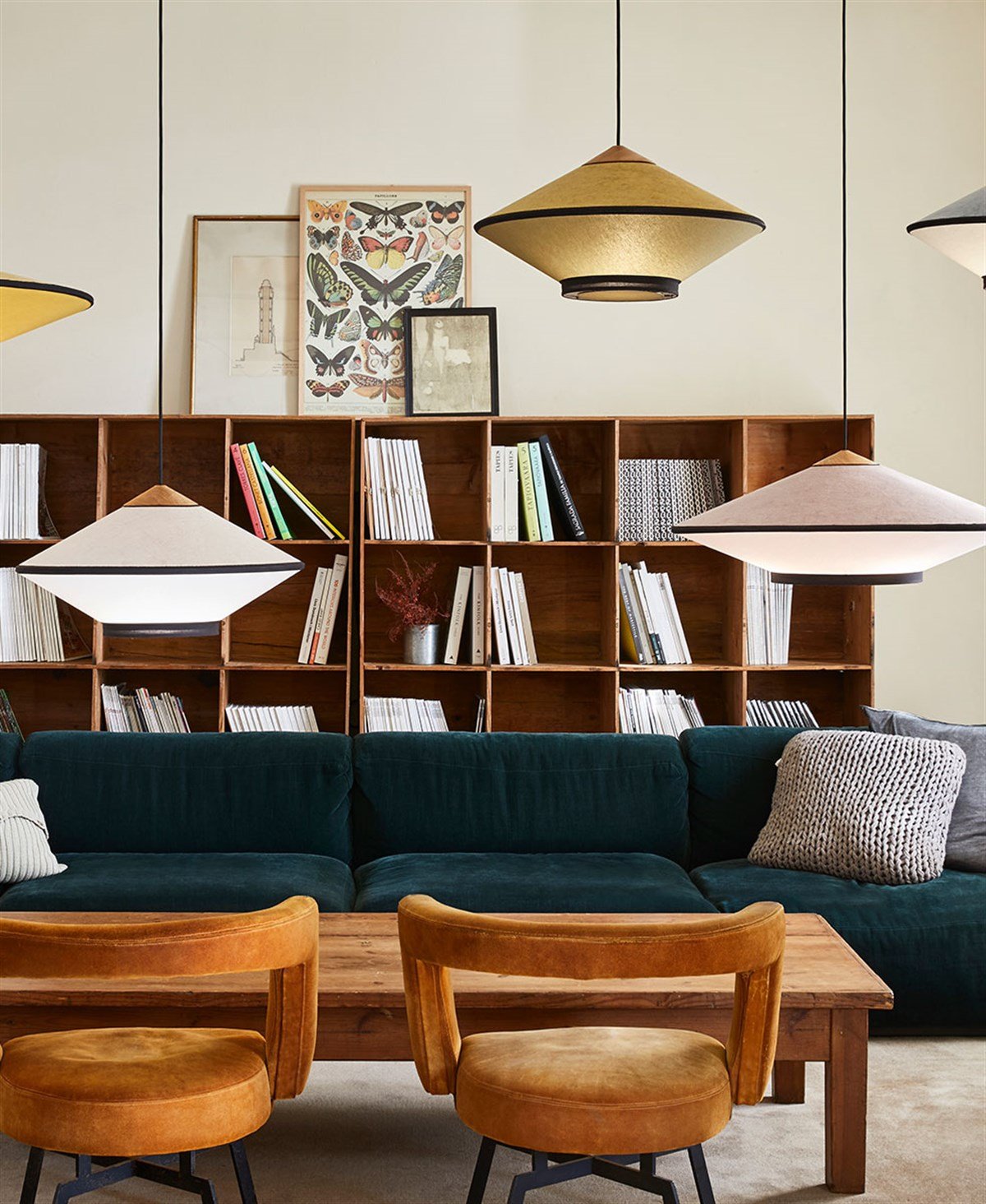 Cymbal, odayı yumuşak bir ışıltıyla yakalayan kumaş ve ahşabın uyumlu bir kombinasyonudur.