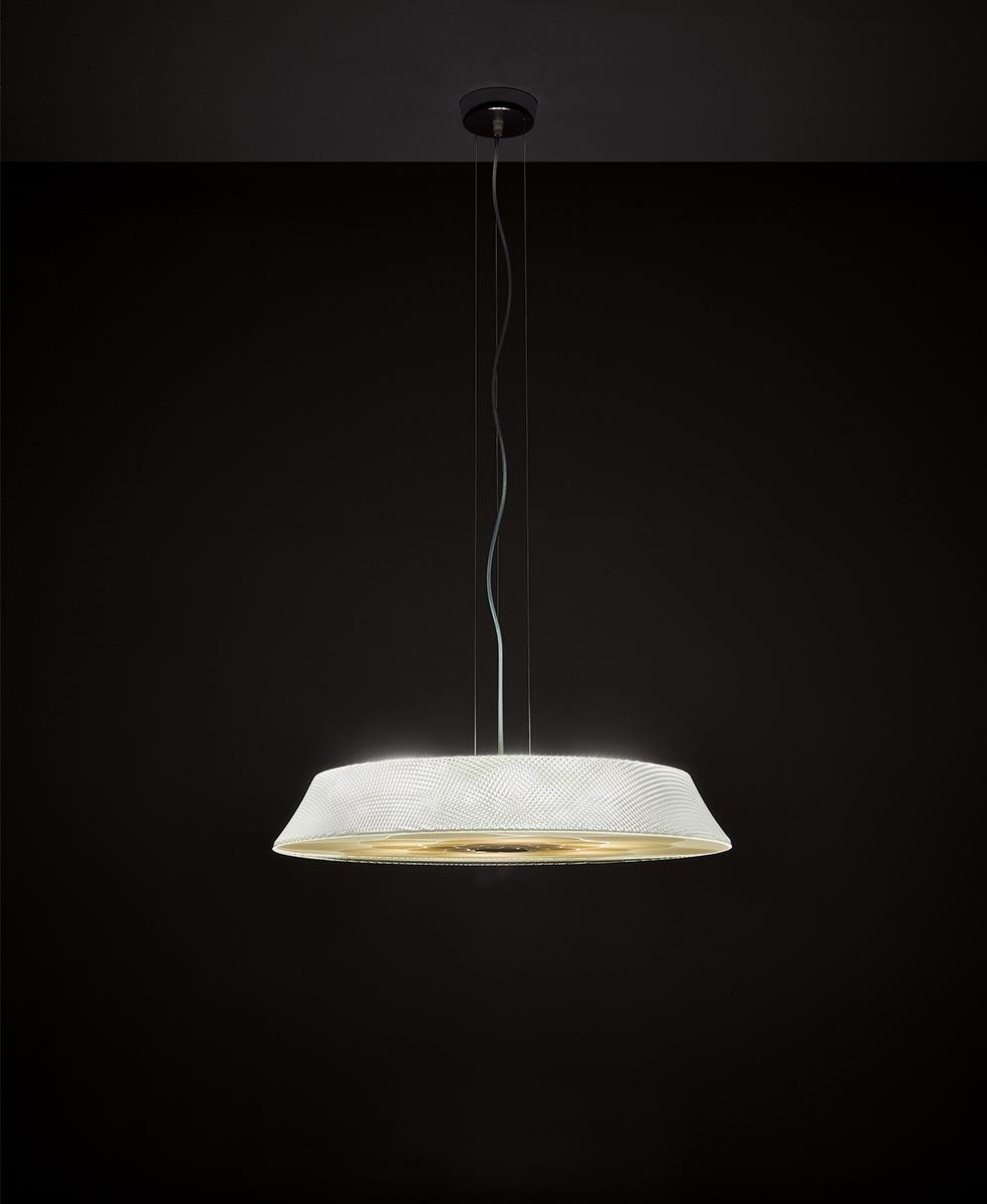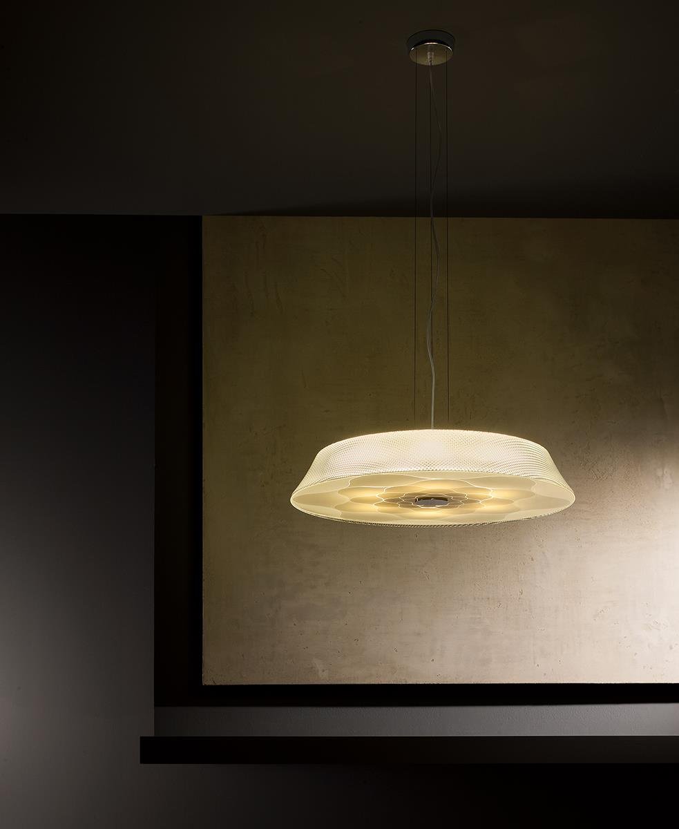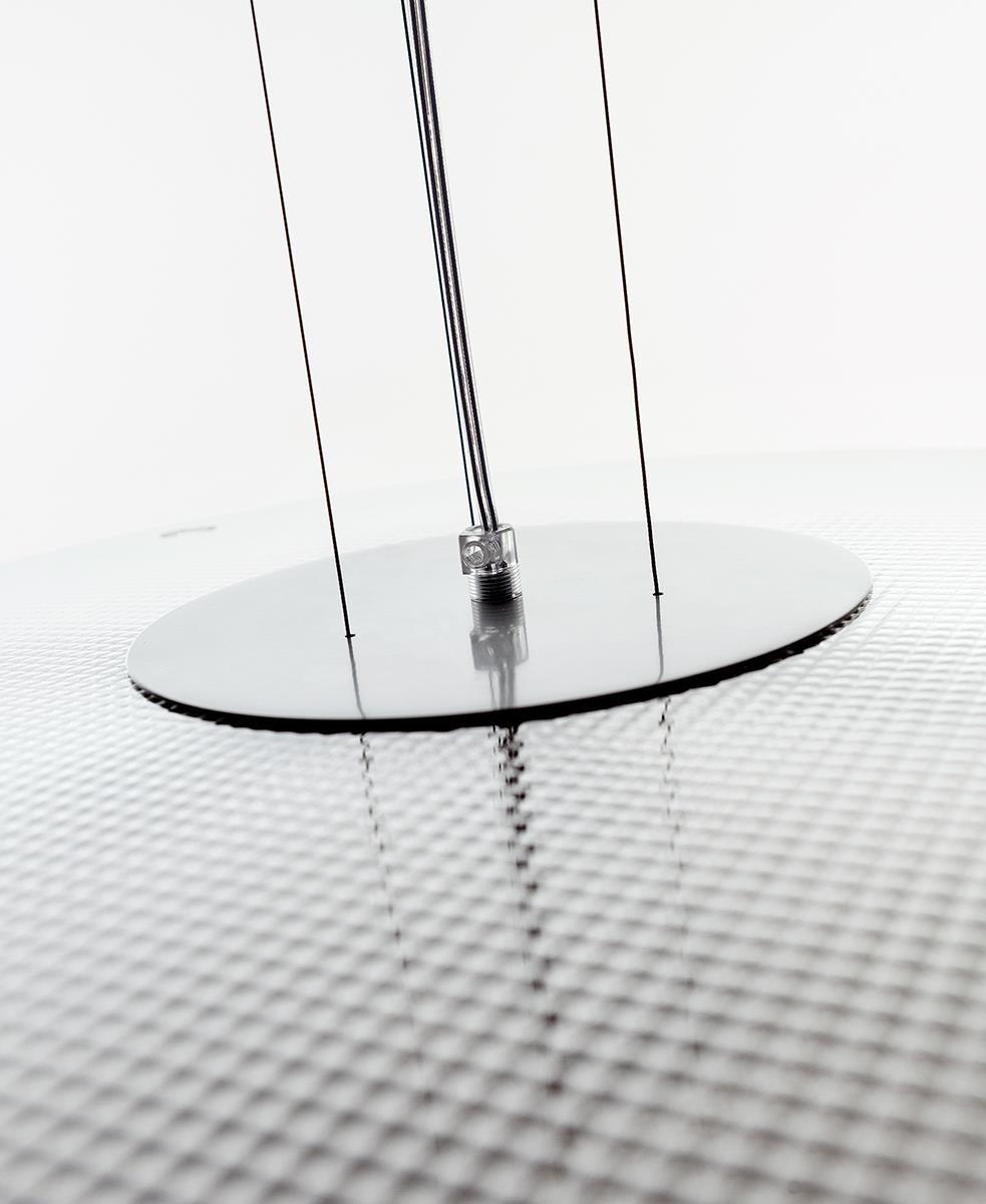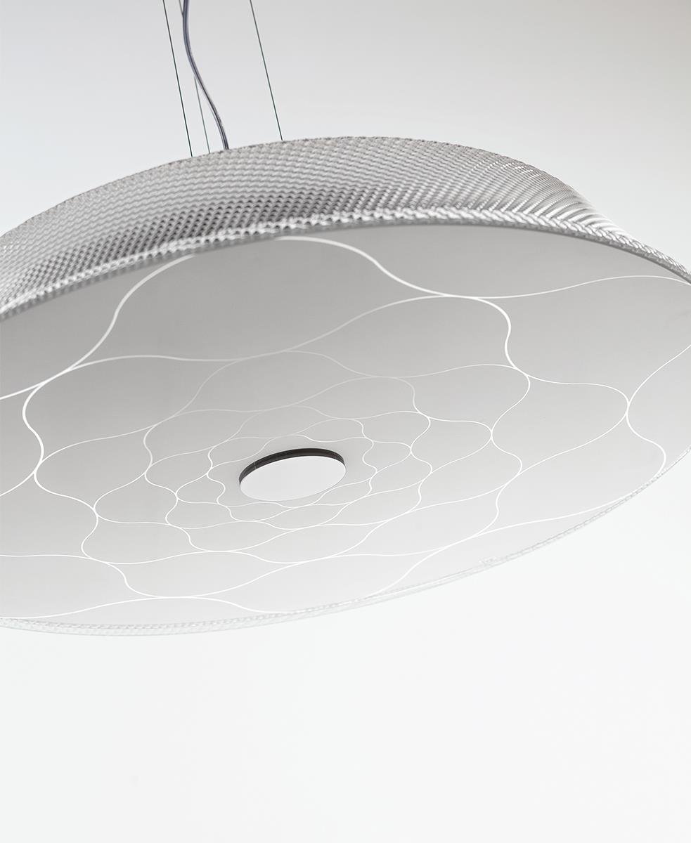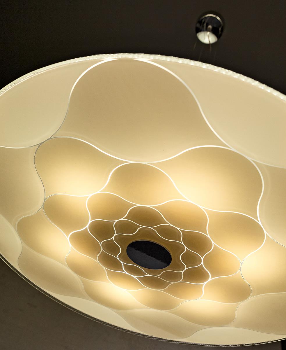 Birkaç kat serigrafi ile süslenen cam difüzör, ürüne ancak lamba yandığında görülebilecek bir dekorasyon kazandırıyor.