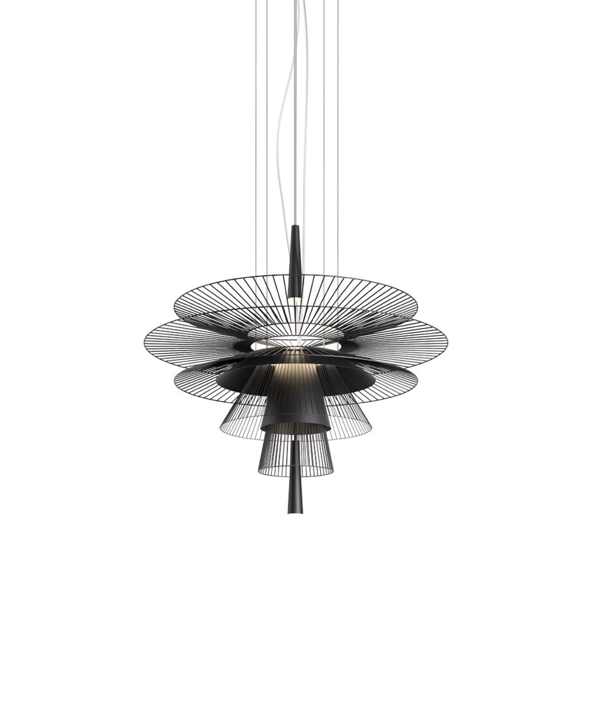 Bu anıtsal aydınlatma, geniş ve açık bir yapı oluşturmak için istiflenen beş havadar tel metal hacmiyle öne çıkar ve modernlik ile gelenek arasında mükemmel bir denge sunar.
