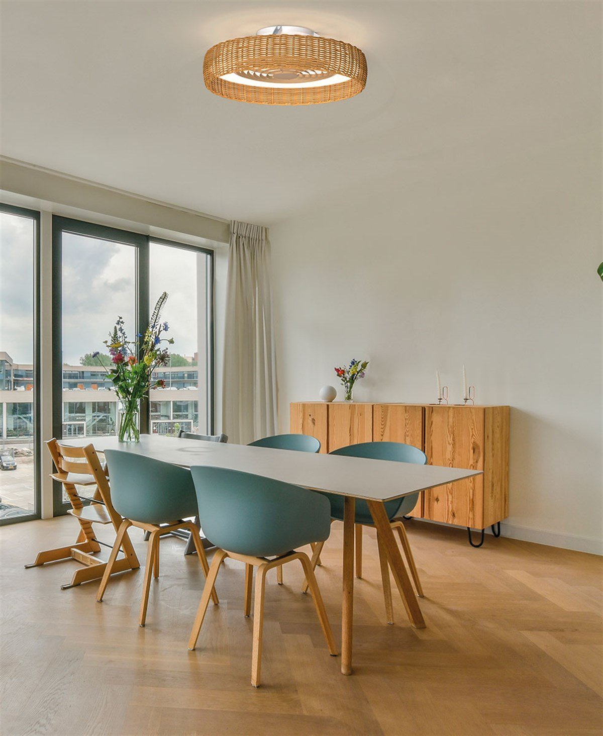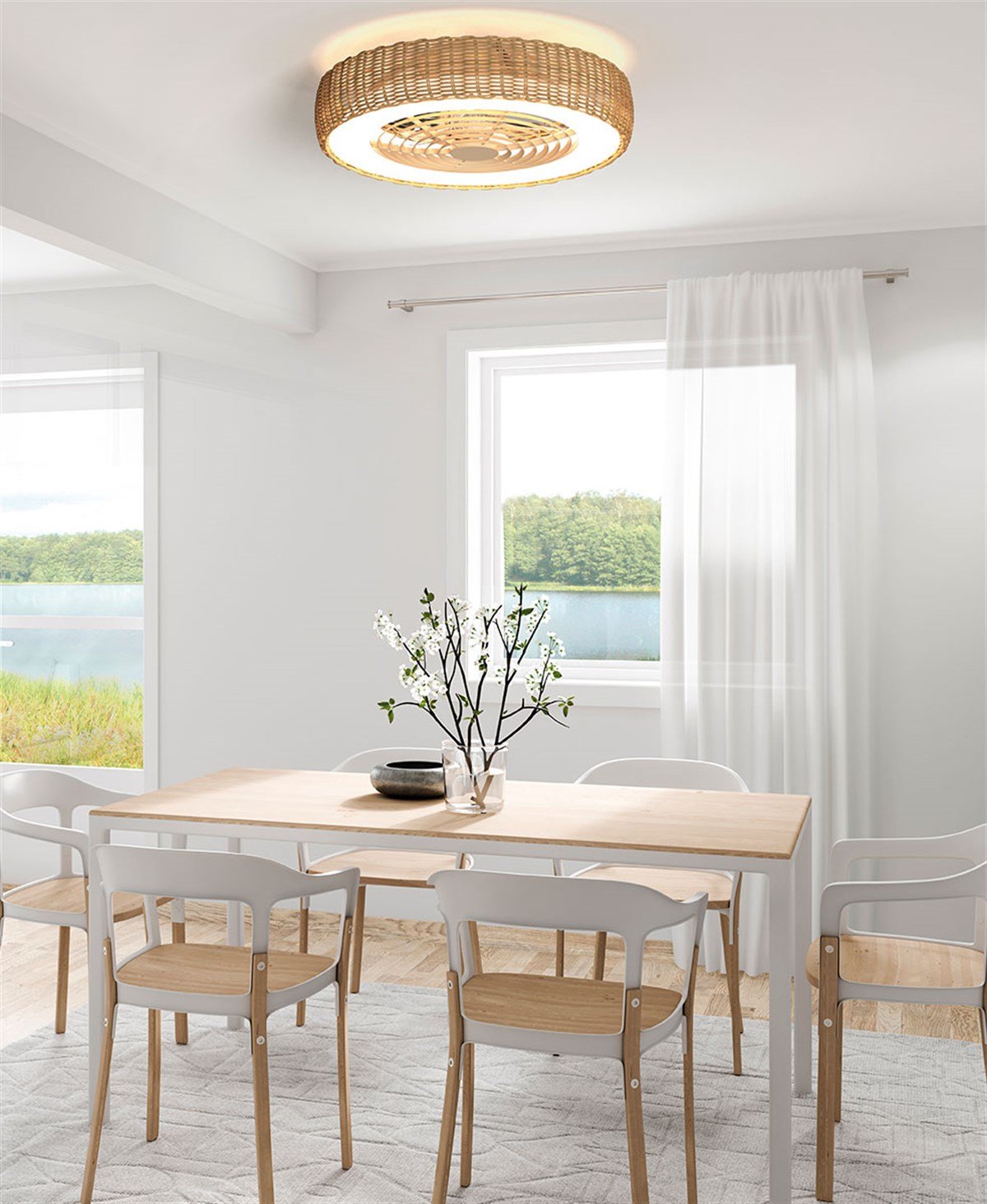 Kısılabilir LED ışıklı fan, yaz - kış fonksiyonlu, uzaktan kumandalı, iki adet kısılabilir montaj seçeneği, doğal görünümlü.