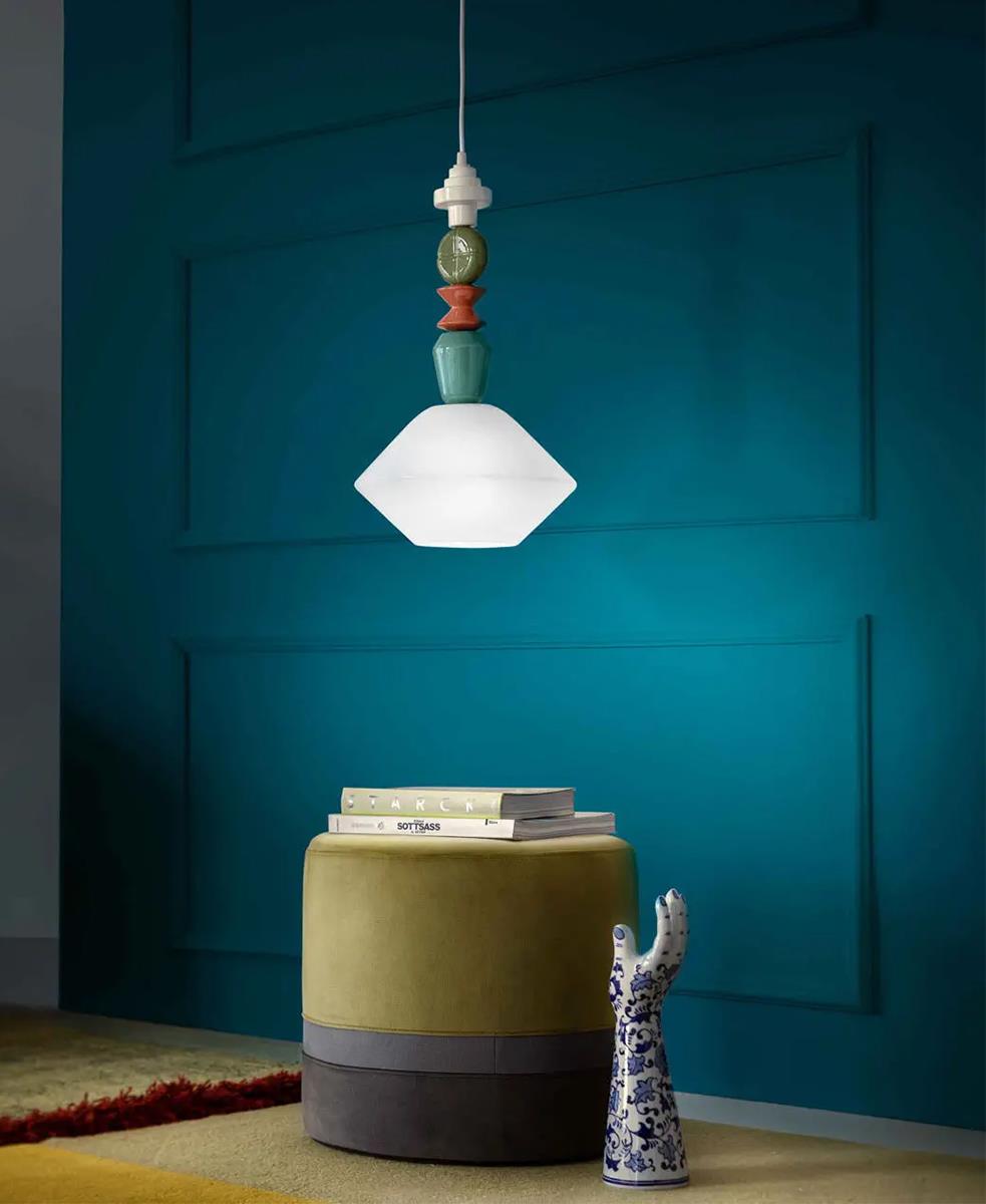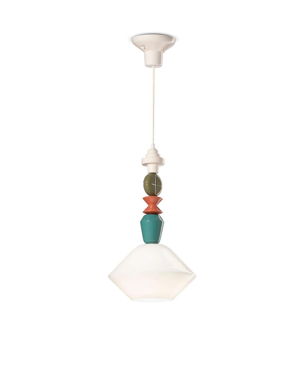 Bir mücevher gibi, parlak seramik elemanlar çeşitli ve renkli bir zincir oluşturan dikey bir seride dizilmiştir.