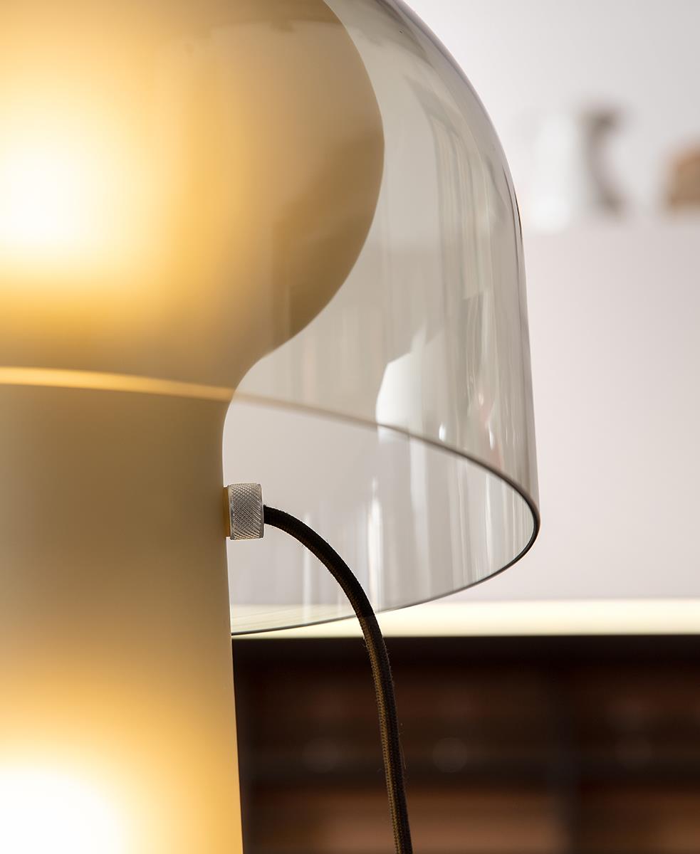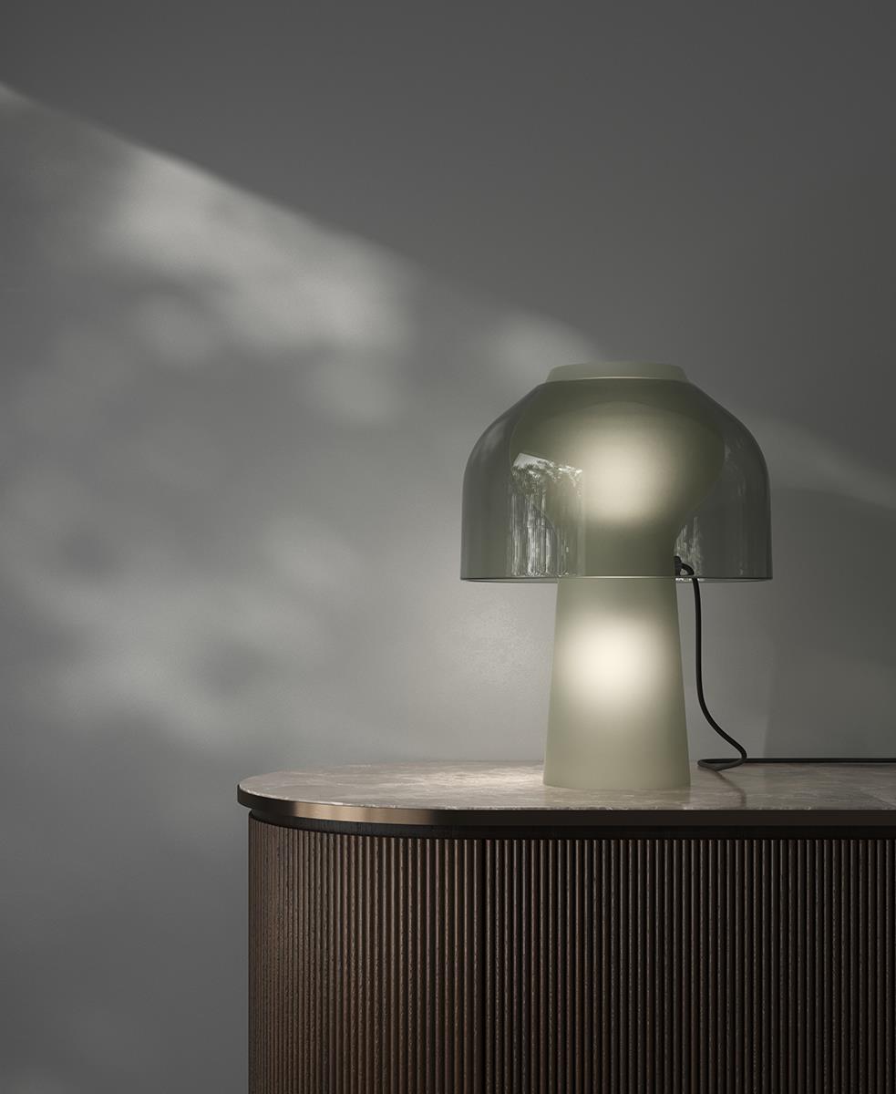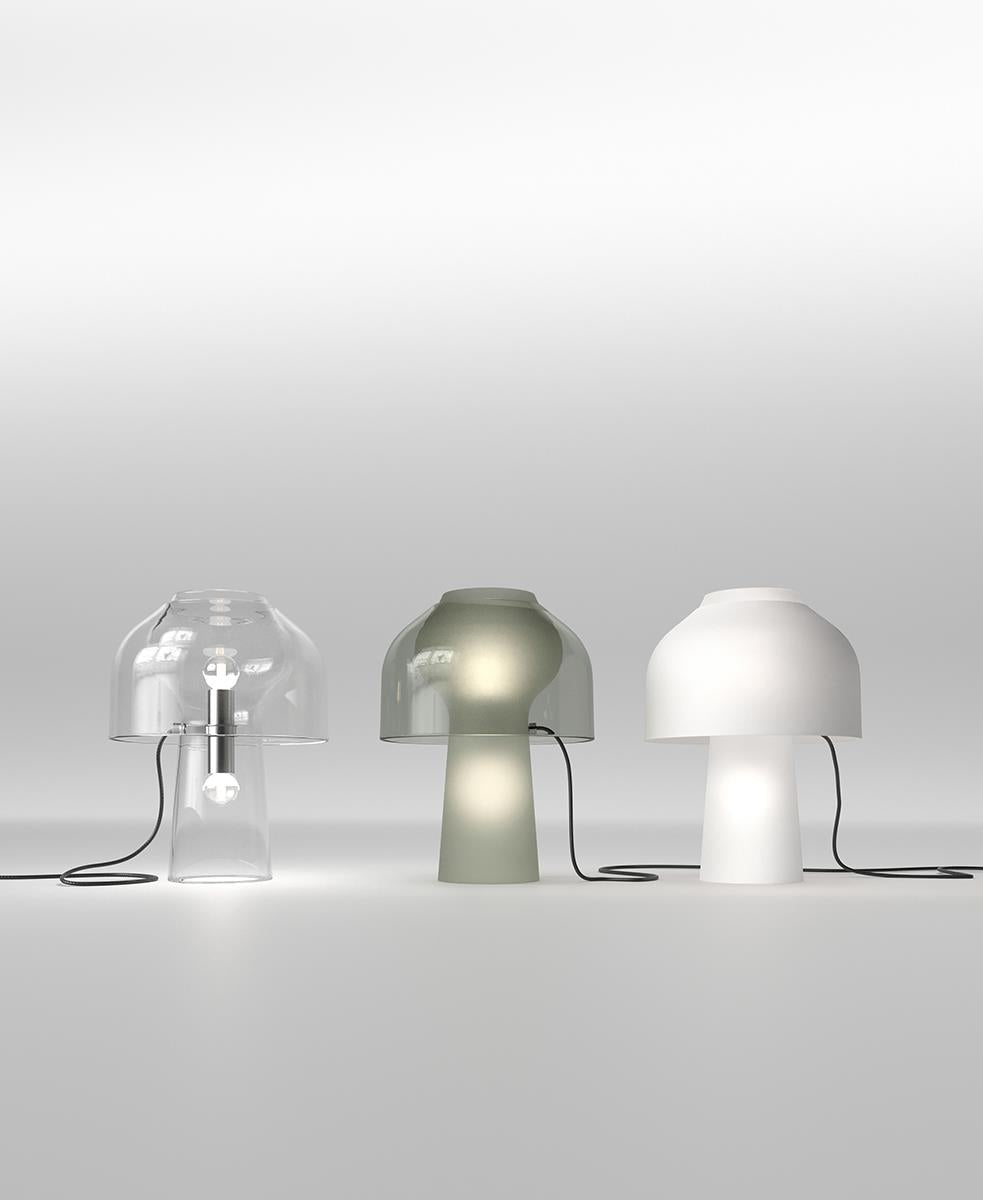 Giorgio Silla tarafından tasarlanan kıvrımlı ve zarif masa lambası, aynı eğrisel şekilde ve aynı kırılgan, eterik malzemeden yapılmış olmasına rağmen, ona üç farklı kişilik kazandıracak kadar farklı bir estetiğe sahip: taban ve abajurun içine yerleştirilmiş çift ışığı göstermek için oluşturulmuş üfleme camdan şeffaf bir vual, taban ve abajur arasındaki farkı söylemeyi zorlaştıran buzlu beyaz camın genel görünümü ve lambanın gövdesi için füme camdan iki tonlu bir parça ve difüzör için şeffaf cam.