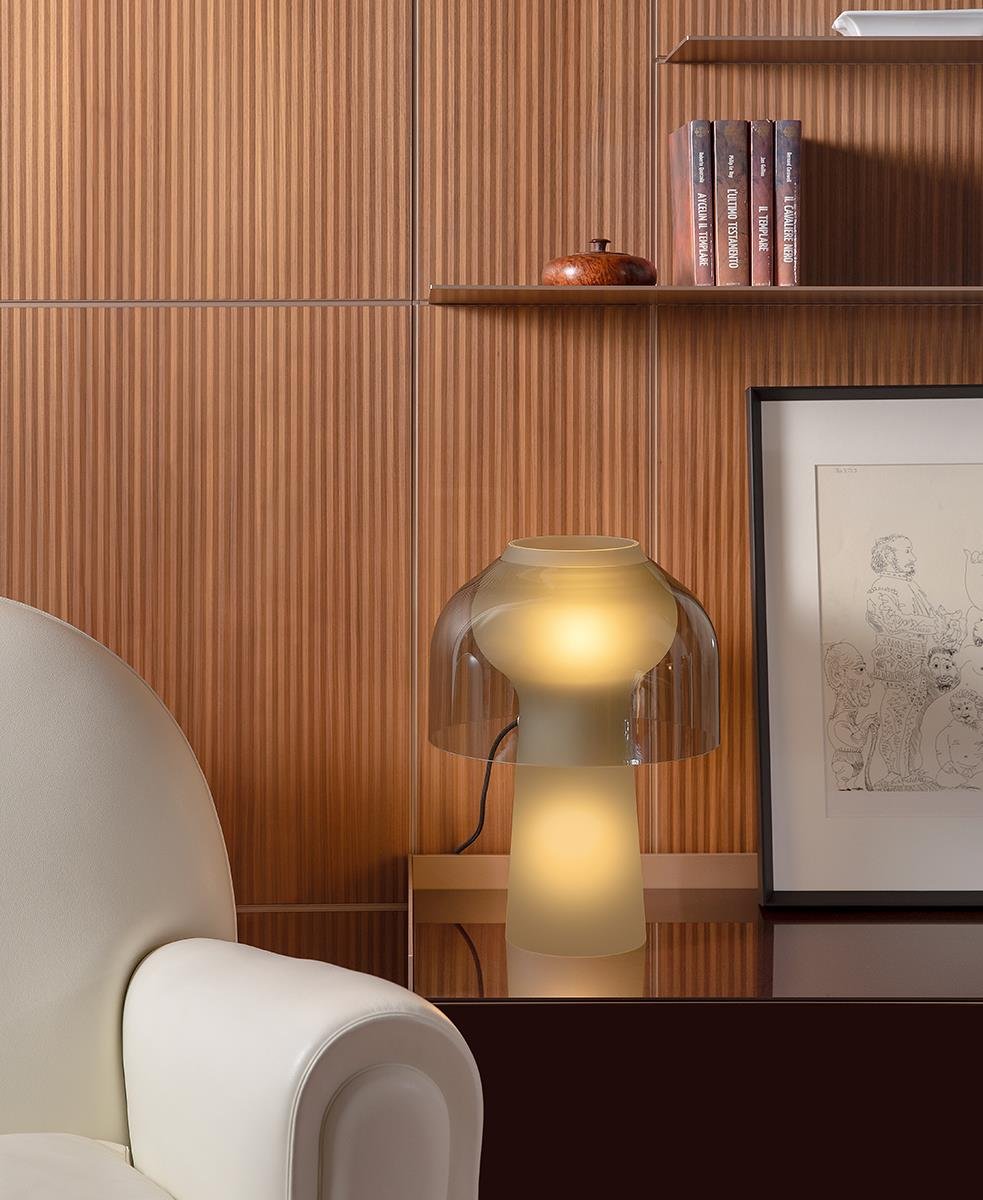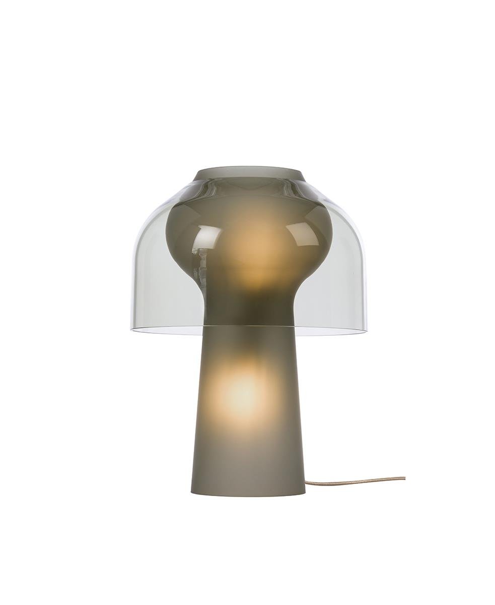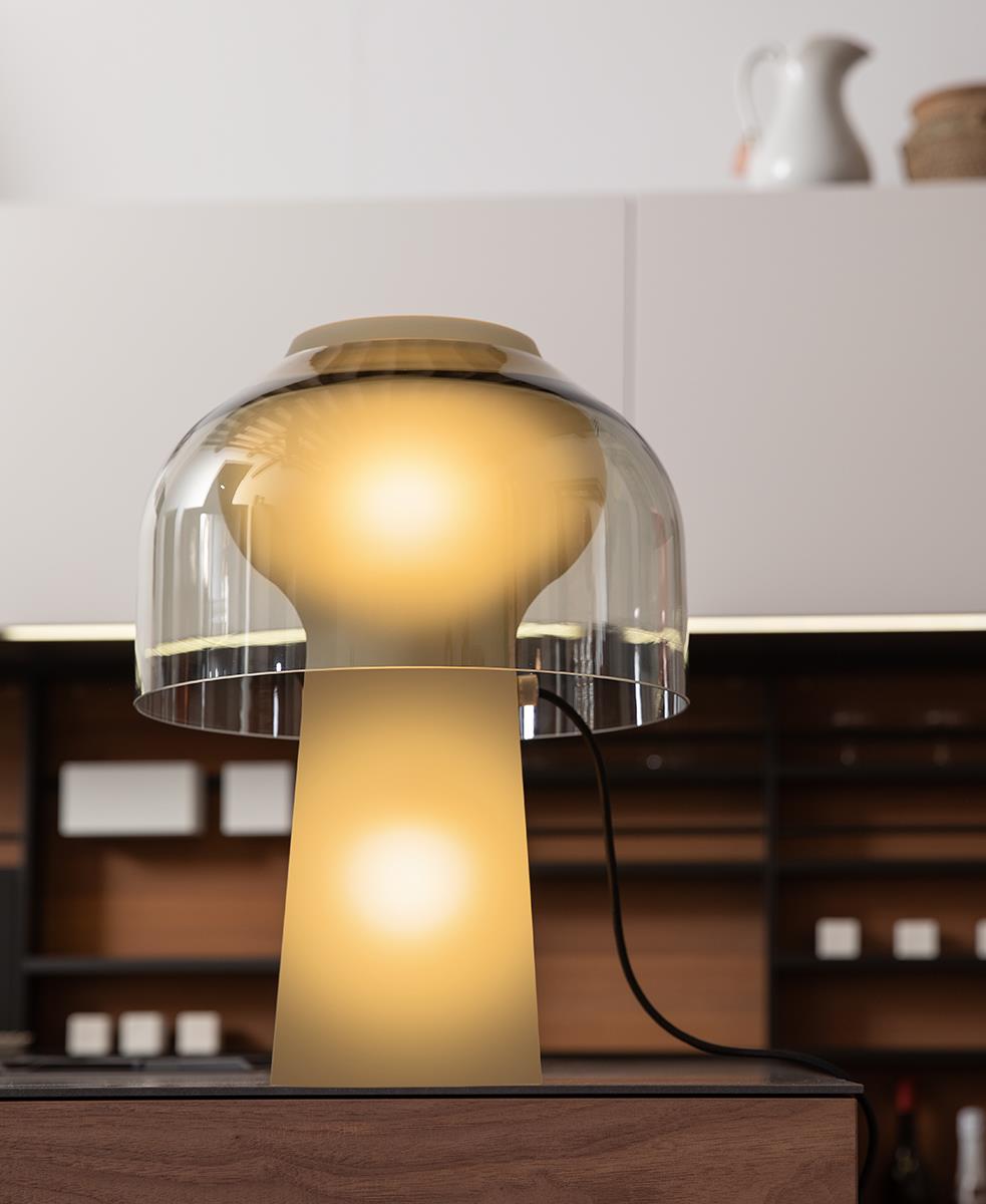 Giorgio Silla tarafından tasarlanan kıvrımlı ve zarif masa lambası, aynı eğrisel şekilde ve aynı kırılgan, eterik malzemeden yapılmış olmasına rağmen, ona üç farklı kişilik kazandıracak kadar farklı bir estetiğe sahip: taban ve abajurun içine yerleştirilmiş çift ışığı göstermek için oluşturulmuş üfleme camdan şeffaf bir vual, taban ve abajur arasındaki farkı söylemeyi zorlaştıran buzlu beyaz camın genel görünümü ve lambanın gövdesi için füme camdan iki tonlu bir parça ve difüzör için şeffaf cam.