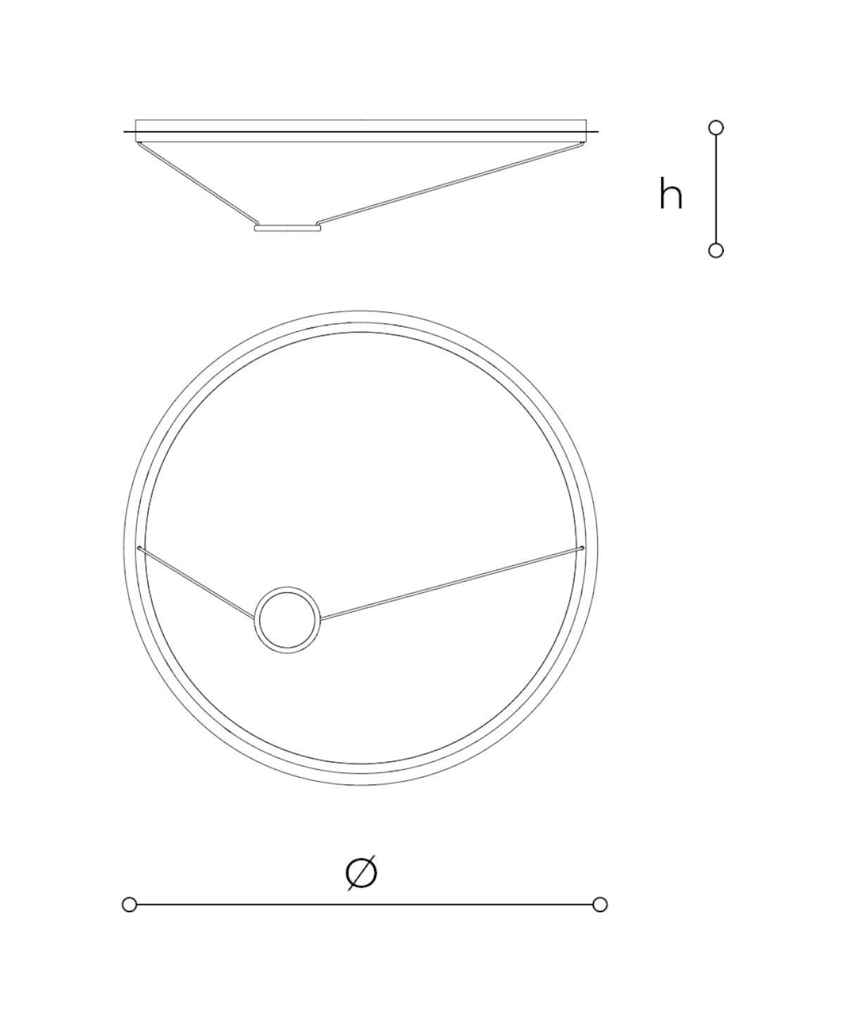 Her biri farklı çapa sahip ve farklı yüksekliklerde yerleştirilmiş iki ışıklı halka, hacimler ve perspektifler arasında dinamik bir oyun yaratarak mekanı sonsuz bir boyuta dönüştürüyor. Üstteki ayna çevresini yakalayıp yansıtarak ışığı gölgeler.