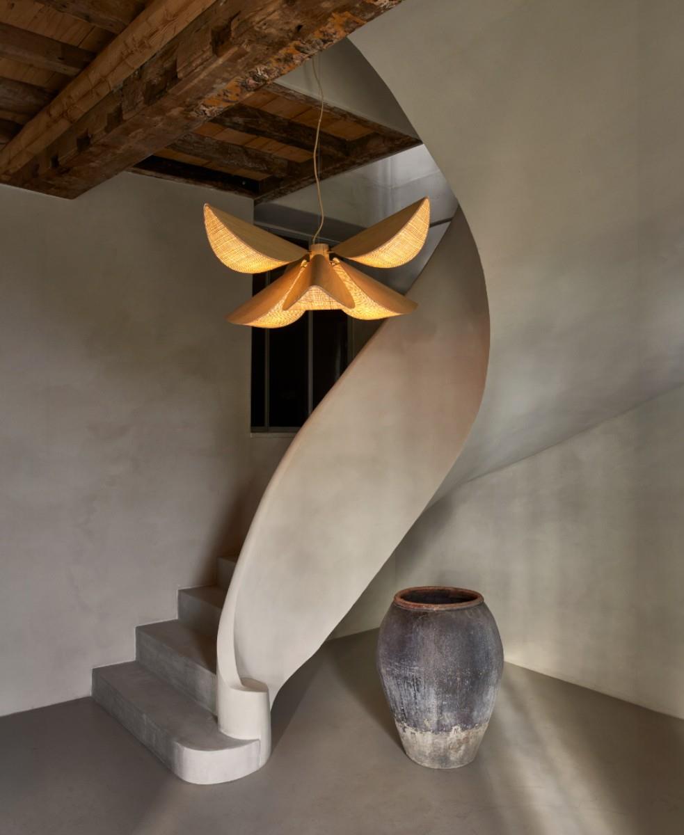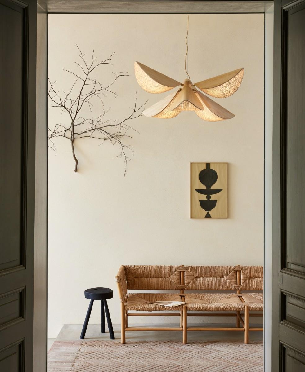 Lys L sarkıt lamba, yumuşak ve hoş bir ışık yayan yaprak şeklindeki abajurlarıyla öne çıkıyor. Rafyadan yapılmış ve ustaca bir manyetik sistemle sabitlenmiş yapraklar, her biri bir E27 ampule ev sahipliği yapıyor. Bu benzersiz tasarım sadece estetik değil; aynı zamanda dağınık ve uyumlu aydınlatmaya izin vererek optimum işlevsellik de sunuyor. Rafya ve metal veya ahşap gibi doğal malzemelerin seçimi, modernden klasiğe kadar çeşitli iç mekan stillerine mükemmel şekilde entegre olan etnik bir bohem dokunuşu katıyor.