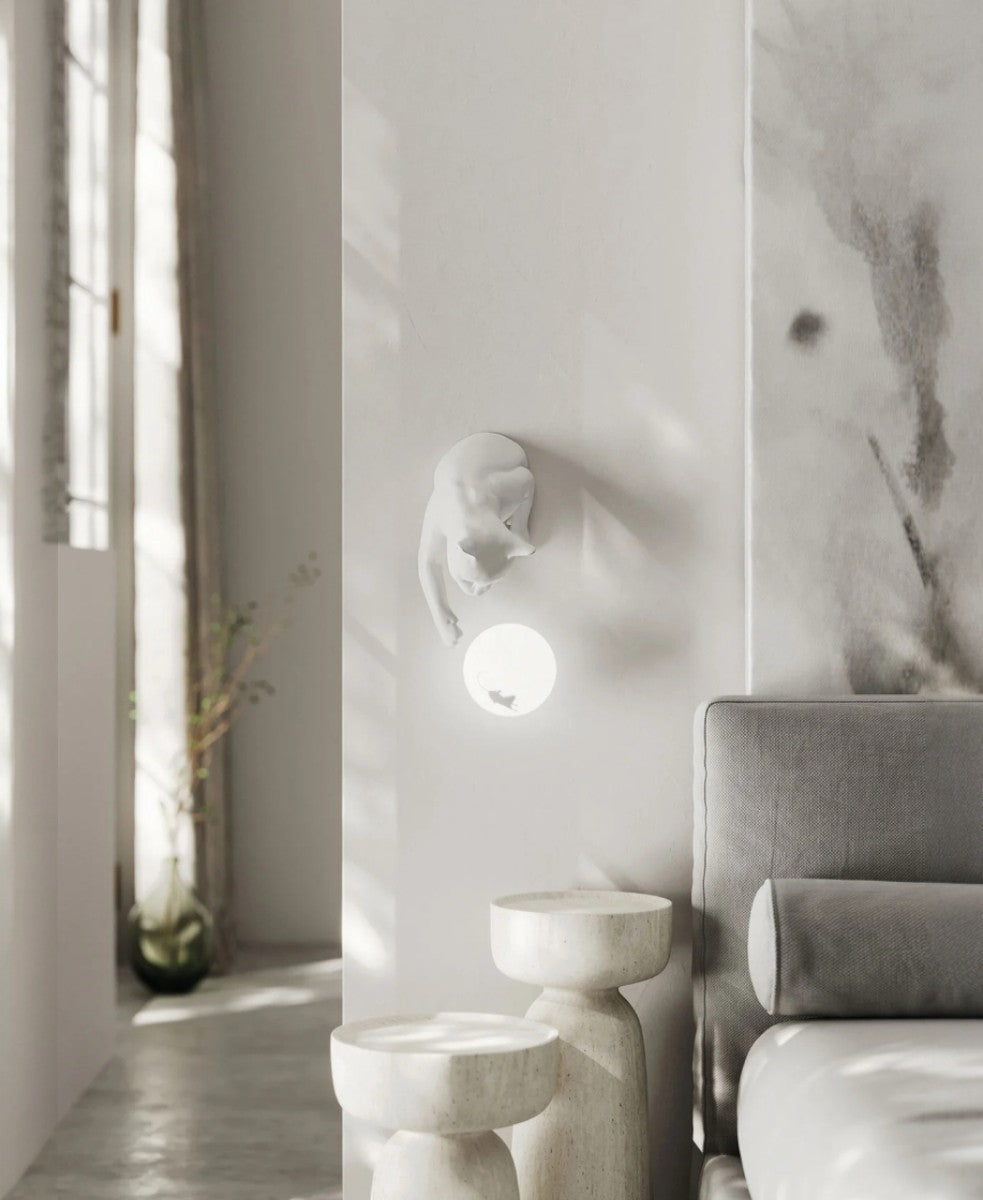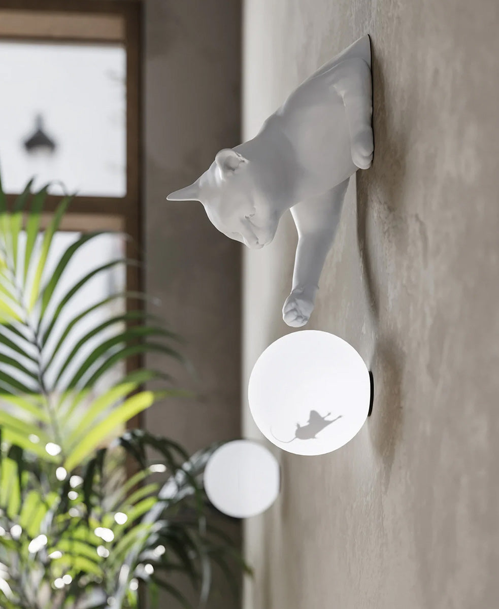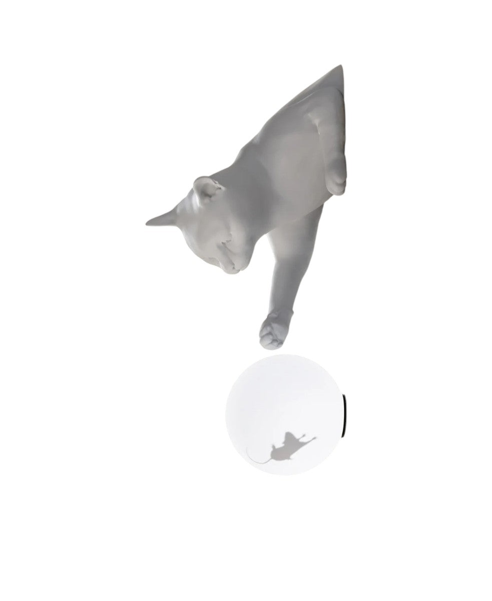 Mat beyaz seramikten yapılmış bir kedi gövdesi ve içinde fare şeklinde bir çıkartma bulunan kömür siyahı seramikten yapılmış bir cam küreden oluşan MAOO, duvara asılabilir veya bir masa üstüne yerleştirilebilir. MAOO, Matteo Ugolini tarafından tasarlanan ve hayvanlar aleminden ilham alan ünlü seramik lamba koleksiyonudur.