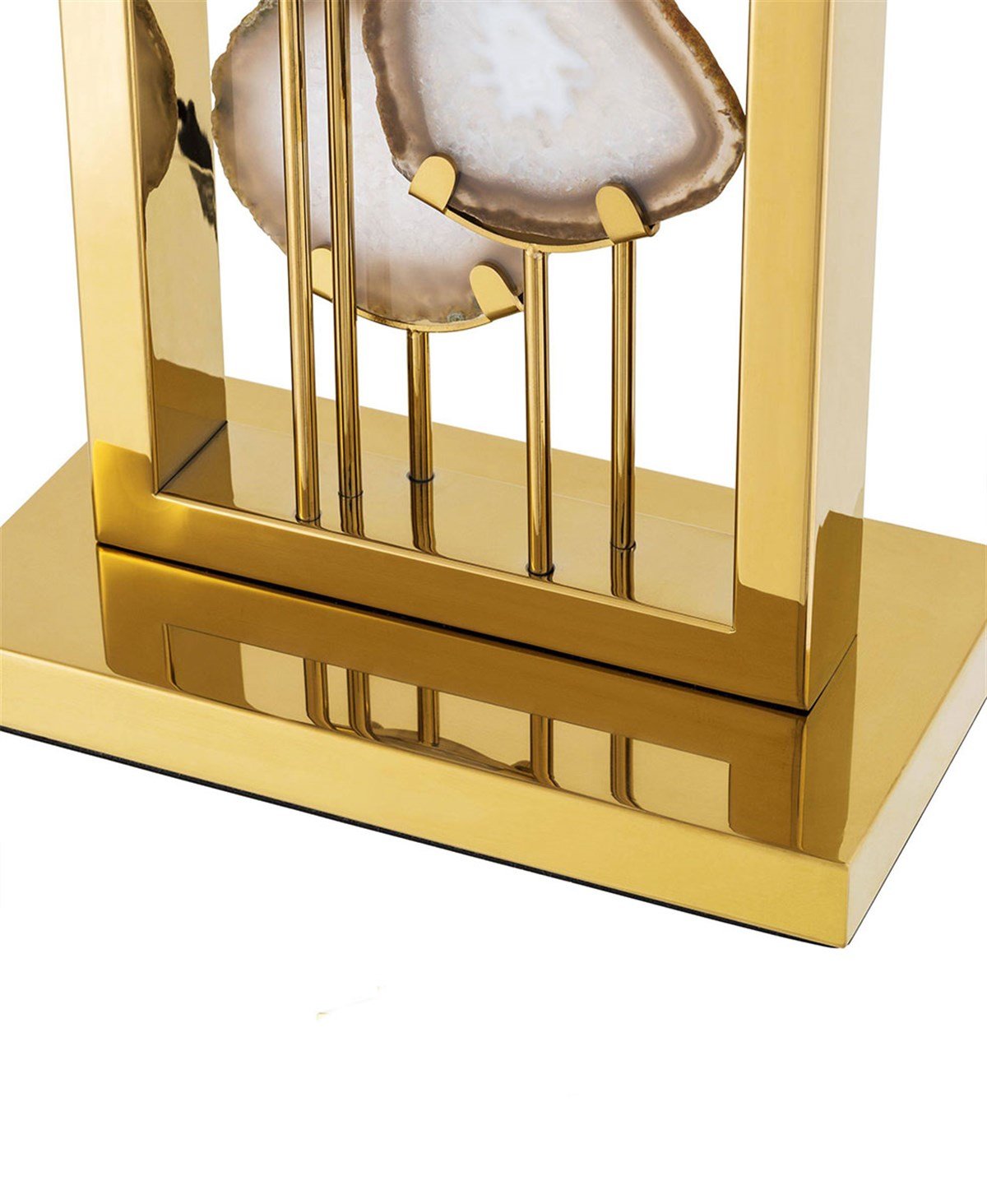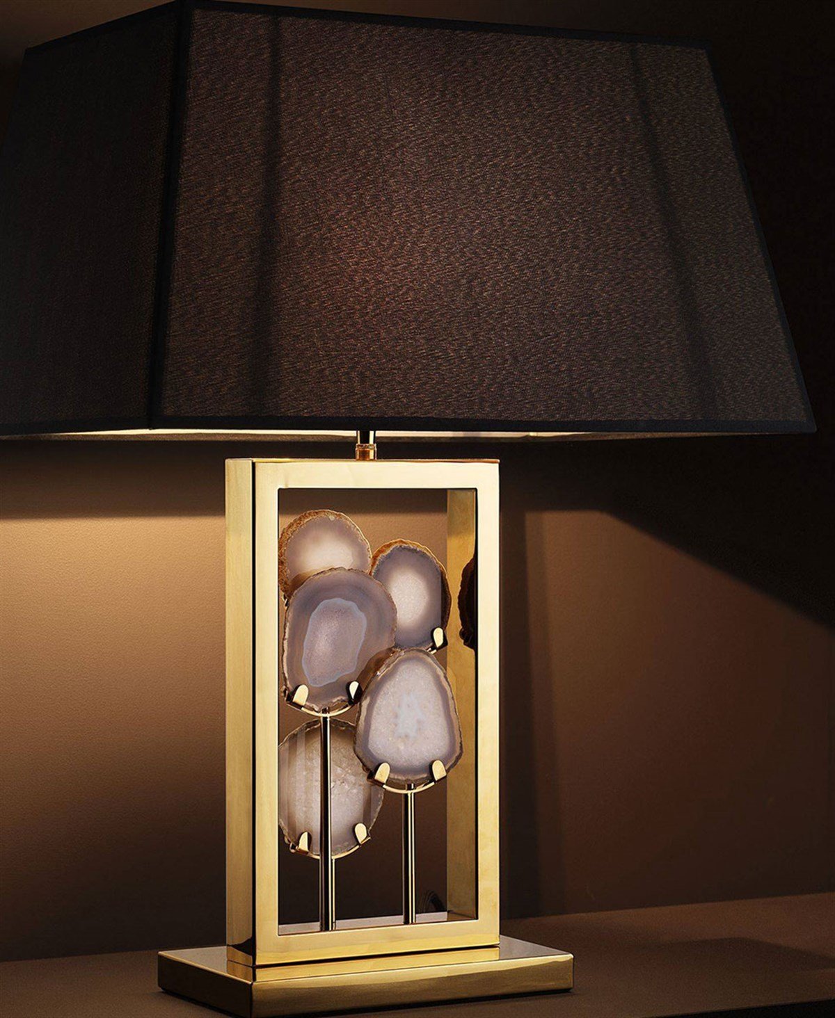 Parlak altın metal aksam Agate taşı Siyah renk şapka Ayak Çapı: 25 cm Şapka genişliği: 50 cm Yükseklik: 66 cm Ampul Adedi: 1 Ampul Gücü: 1 x 40W Ampul Türü: E27 Menşei Hollanda Fiyatlarımıza ampul dahildir.