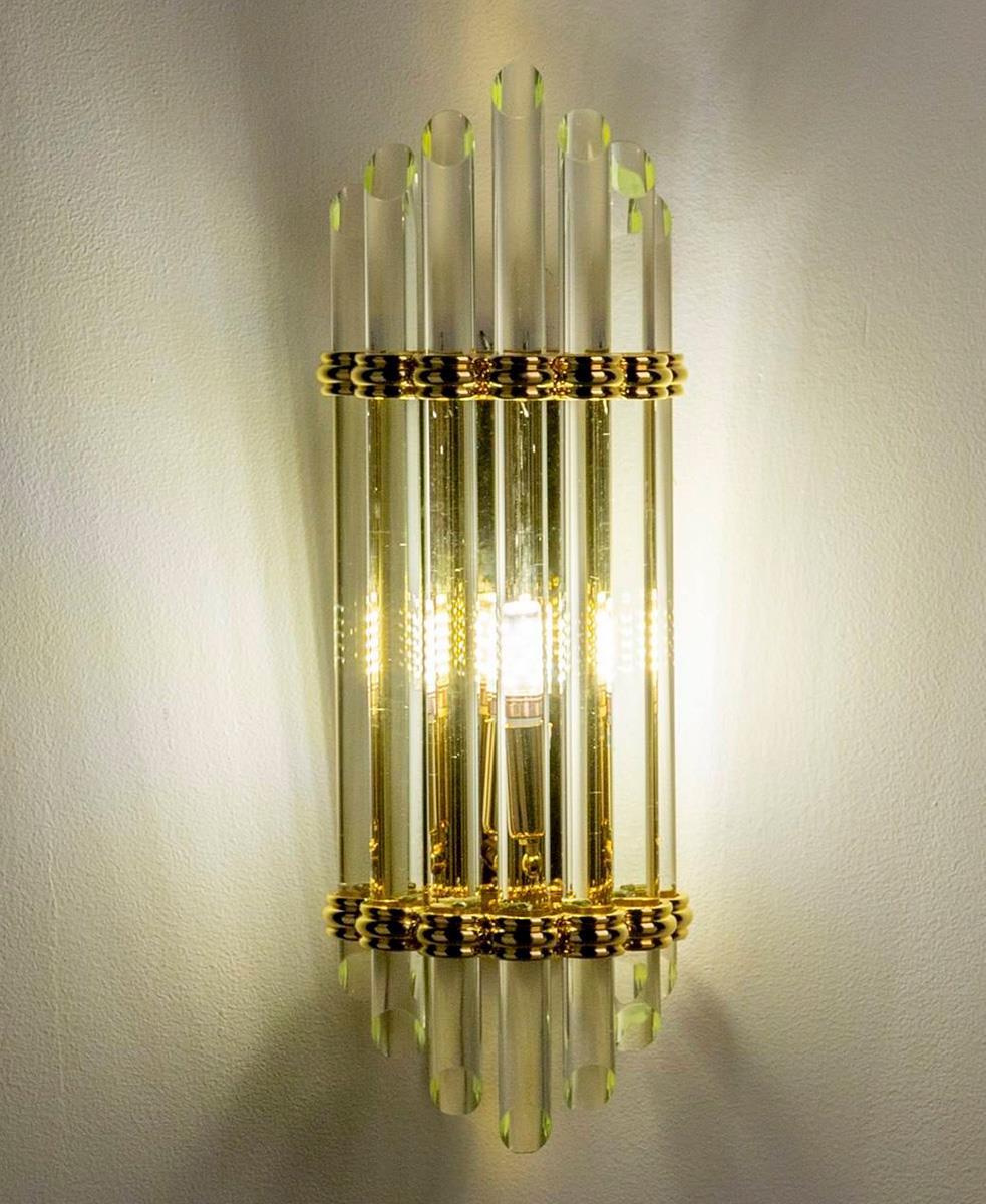 Altın kaplama metal ve özel berrak kristallerden oluşan, Art Deco esintili şık duvar lambası.