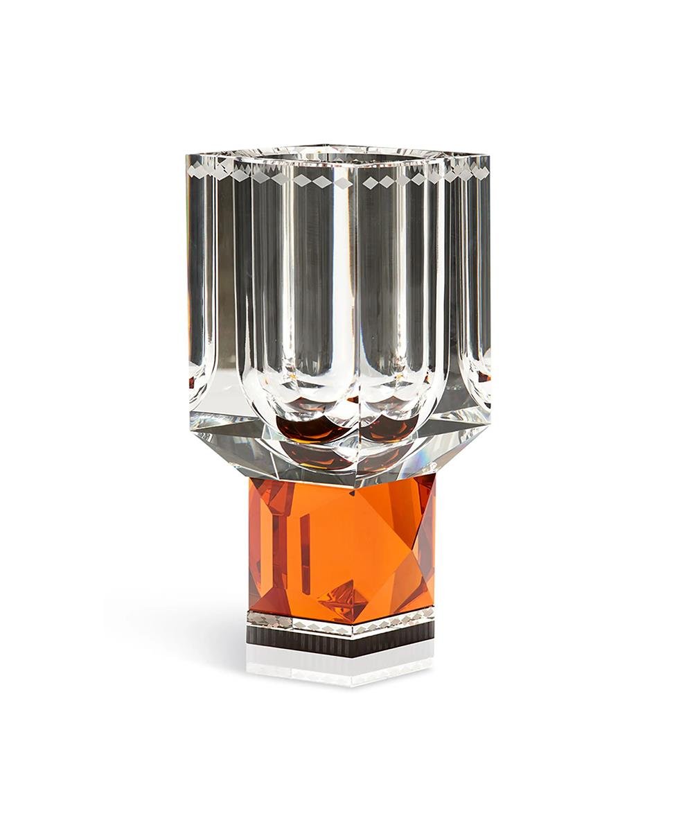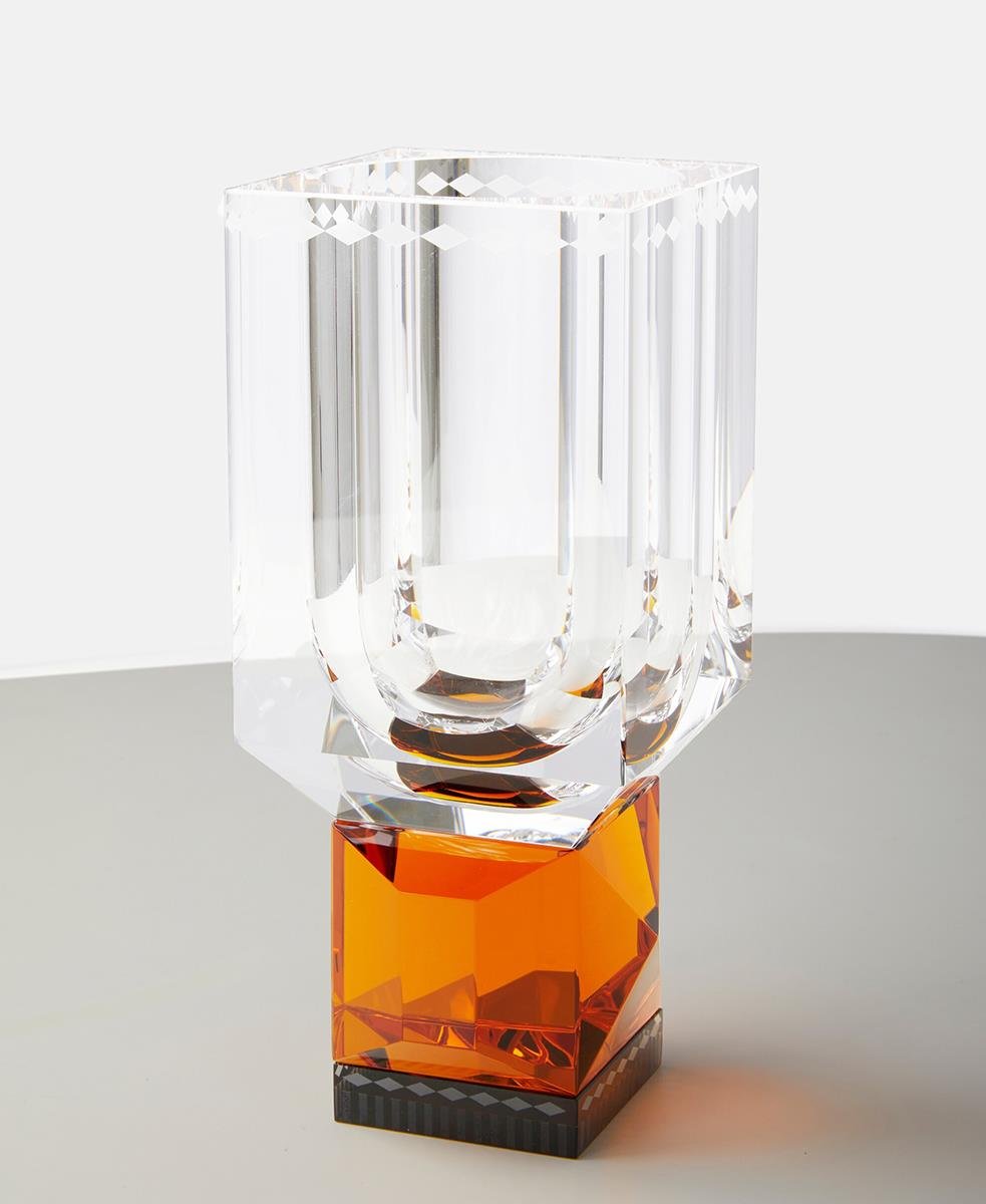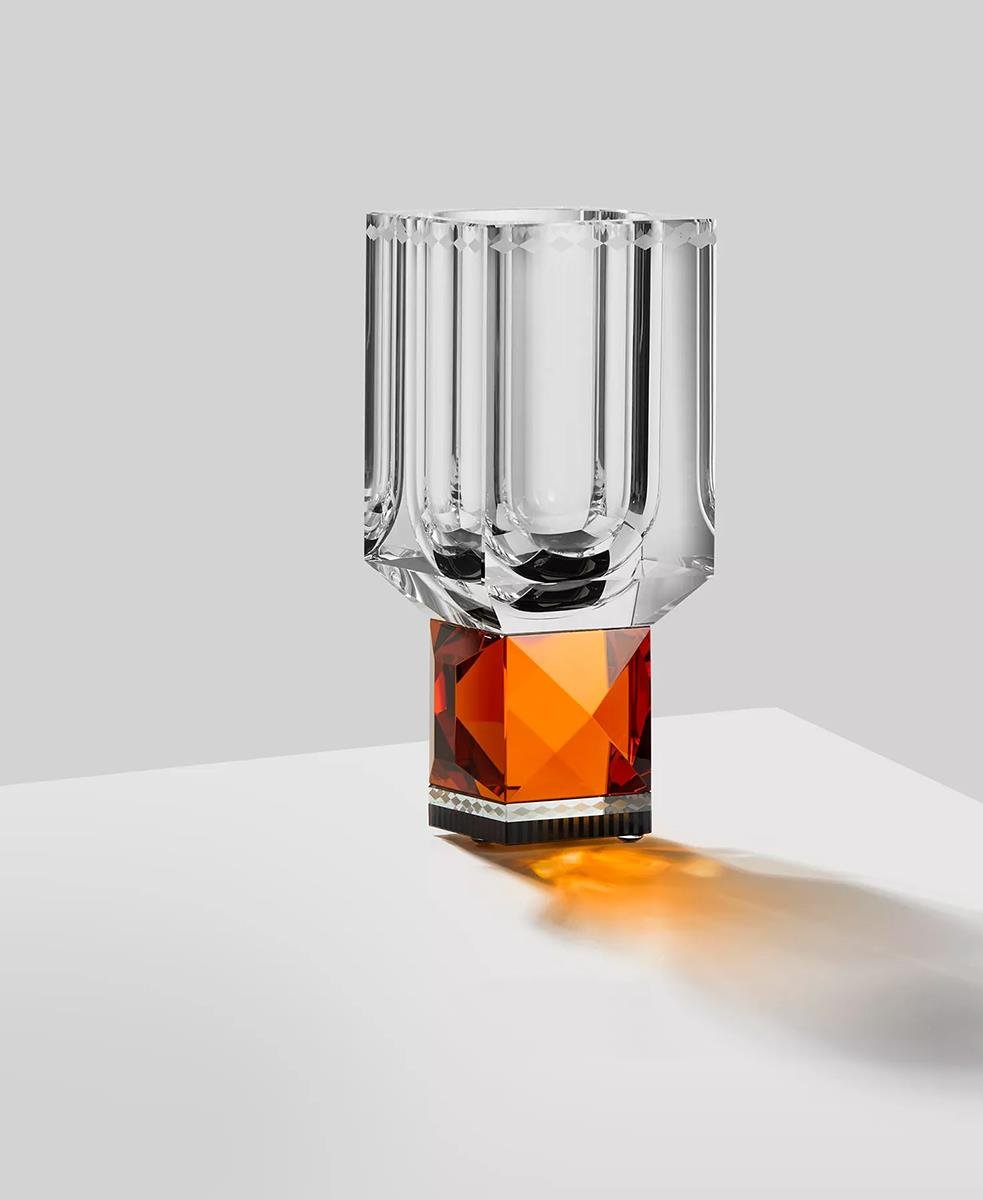 Bu kristal vazonun cesur şekli işlevsellik ve güzellik kavramını bir araya getiriyor. Uzun bir kase ve fasetli bir sapla elle kesilmiş kristalden yapılmıştır.
