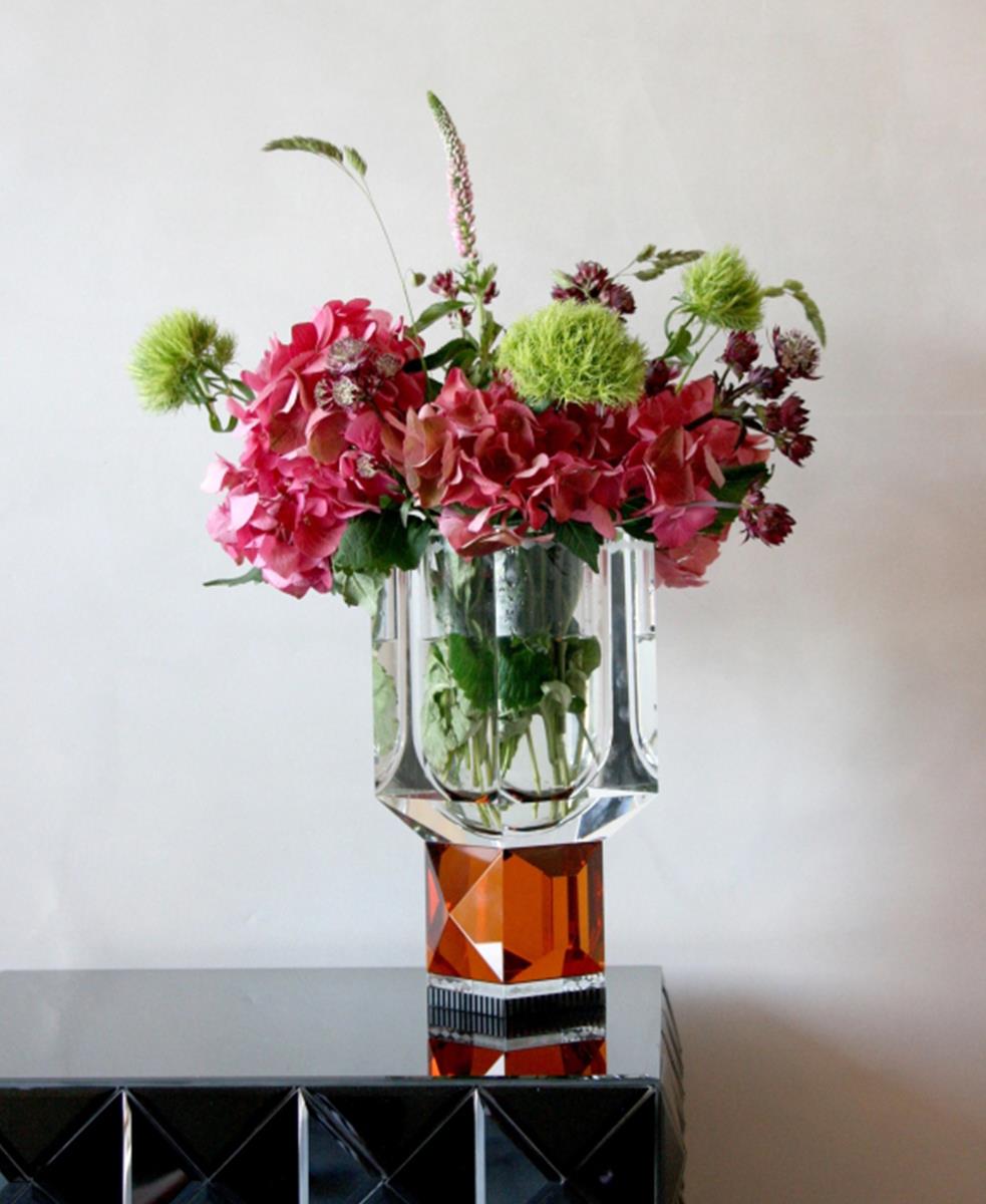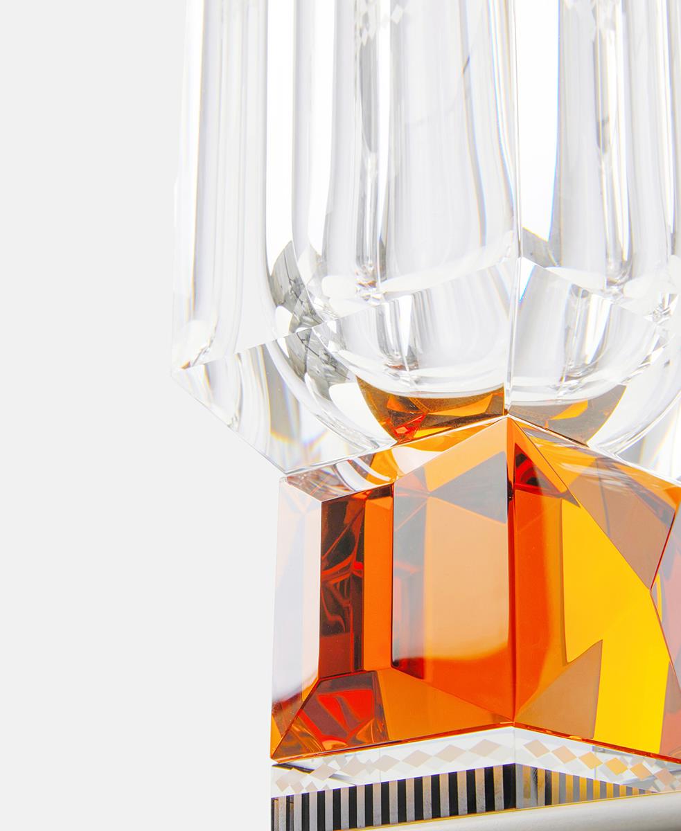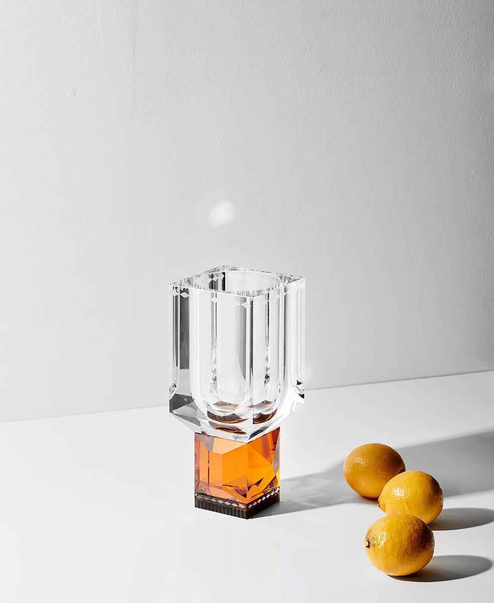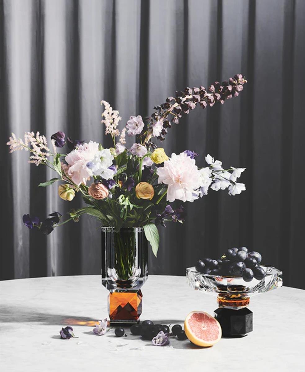 Bu kristal vazonun cesur şekli işlevsellik ve güzellik kavramını bir araya getiriyor. Uzun bir kase ve fasetli bir sapla elle kesilmiş kristalden yapılmıştır.