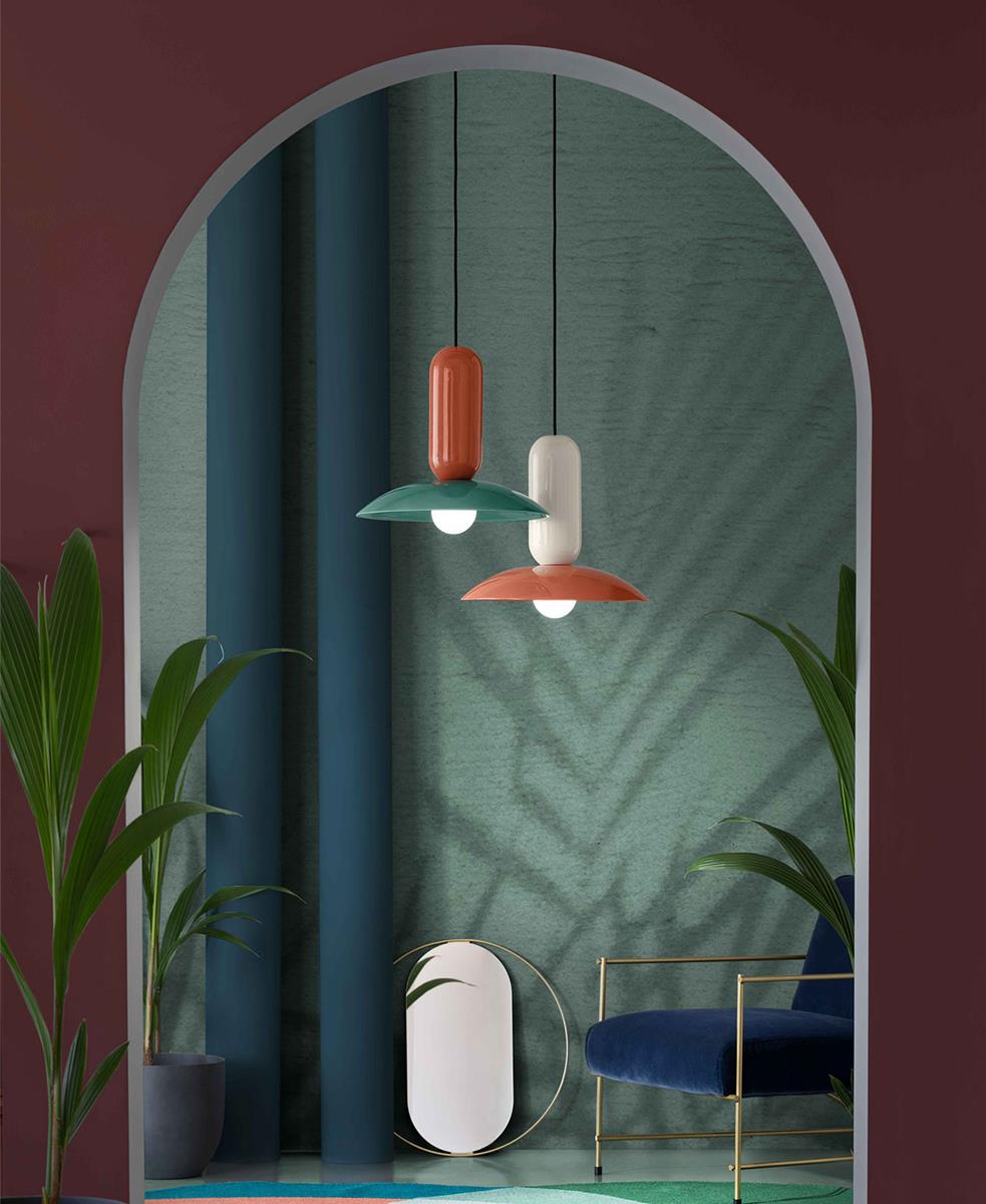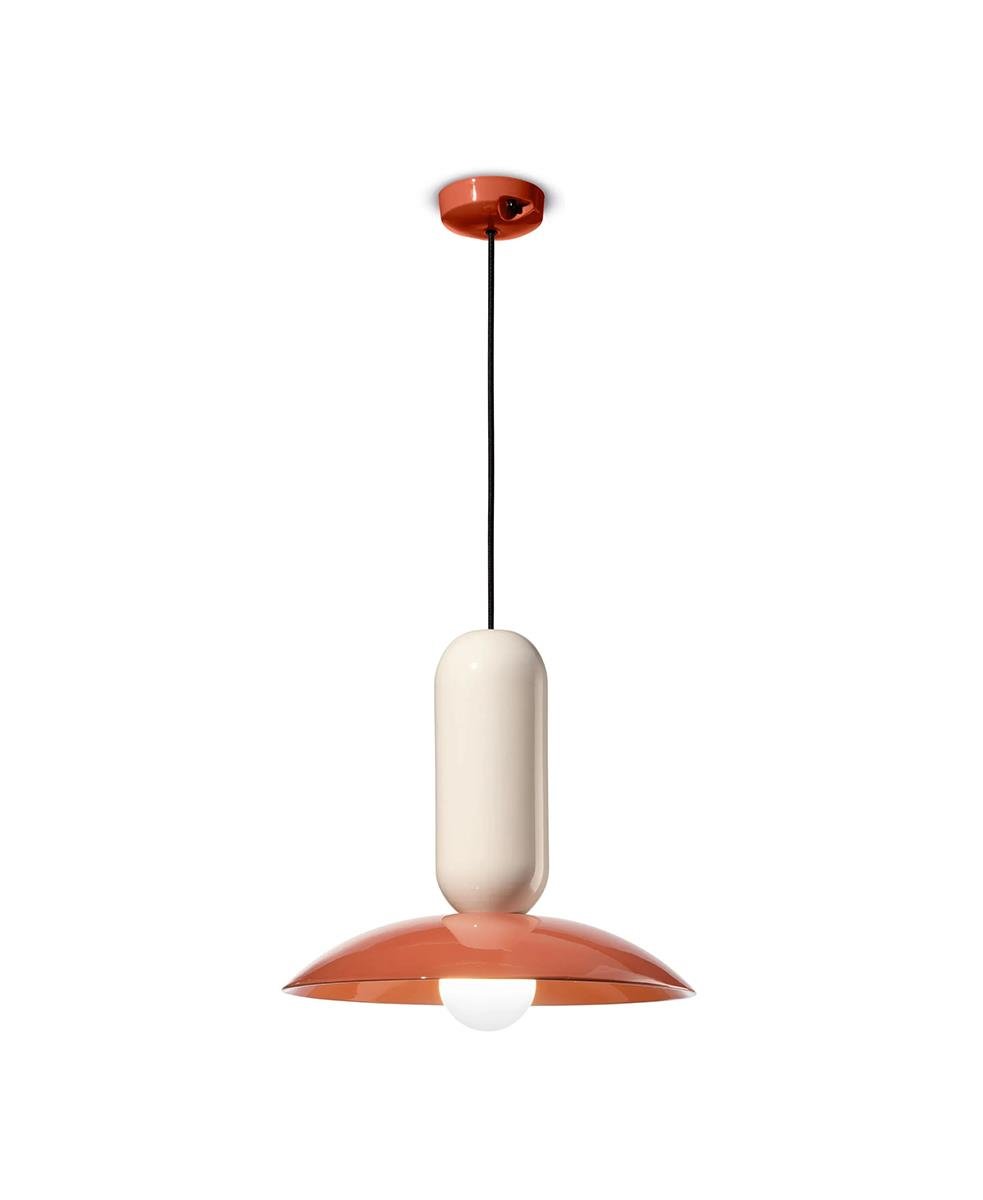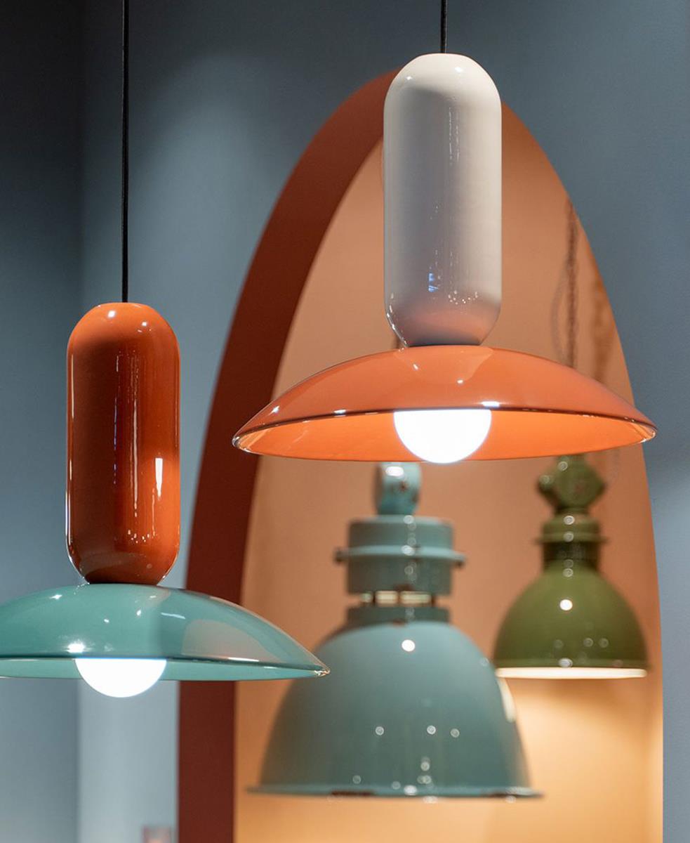 Küresellik ve parlaklıktan oluşan bir diyalektikte birbirleriyle etkileşime giren iki üst üste binen seramik, yüzeyleri vurgulayan ve asılı nesnenin hacimsel uzantısını maksimuma çıkaran parlak bir yüzeyle vurgulanır.