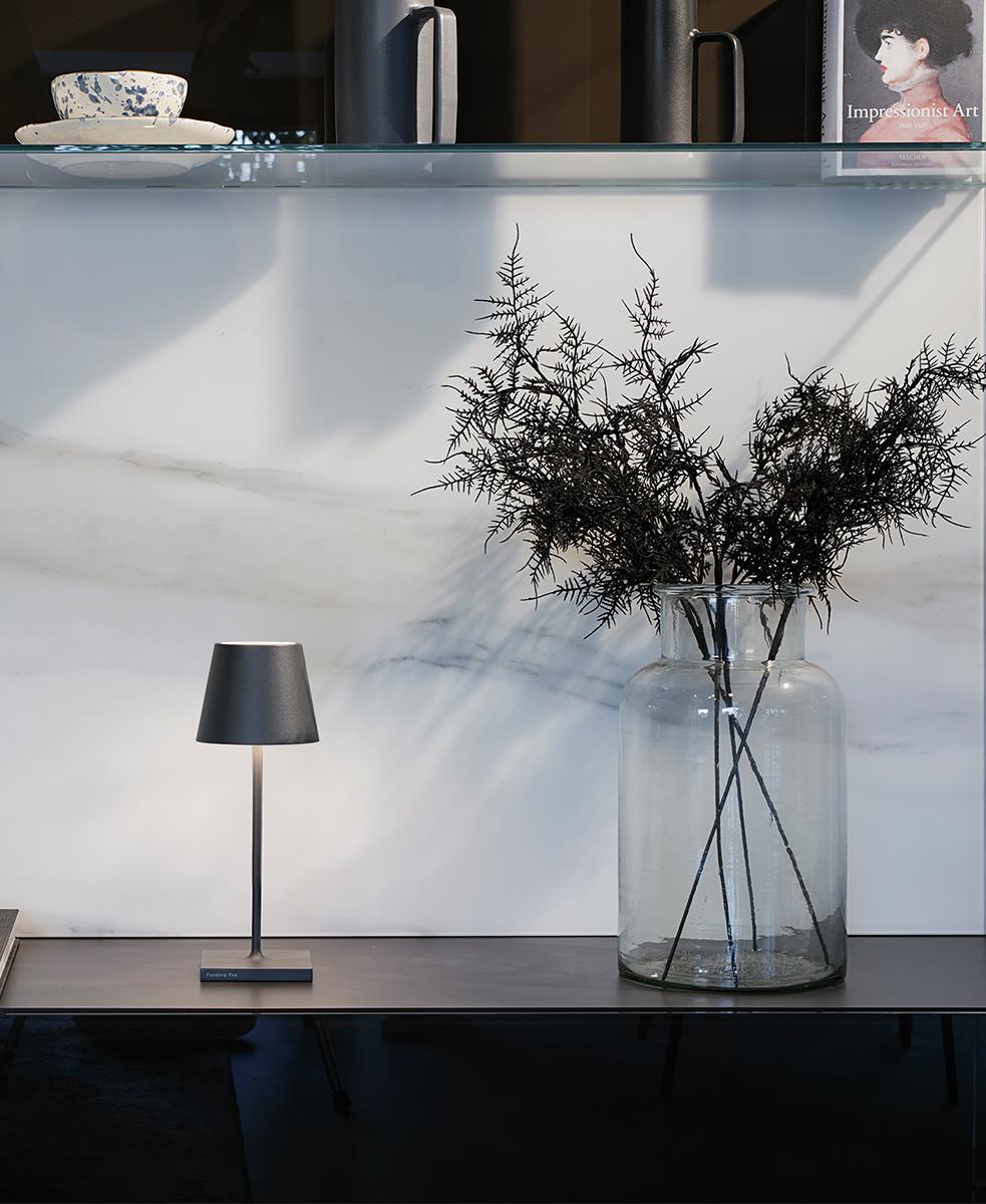 Lamba, üst kısımda bulunan dokunmatik düğmeyle açılıp kapatılır; aynı tuşla ışık akısının yoğunluğunu kısmak ve ışığın renk sıcaklığını 2200K, 2700K ve 3000K arasında seçim yaparak ayarlamak mümkün.