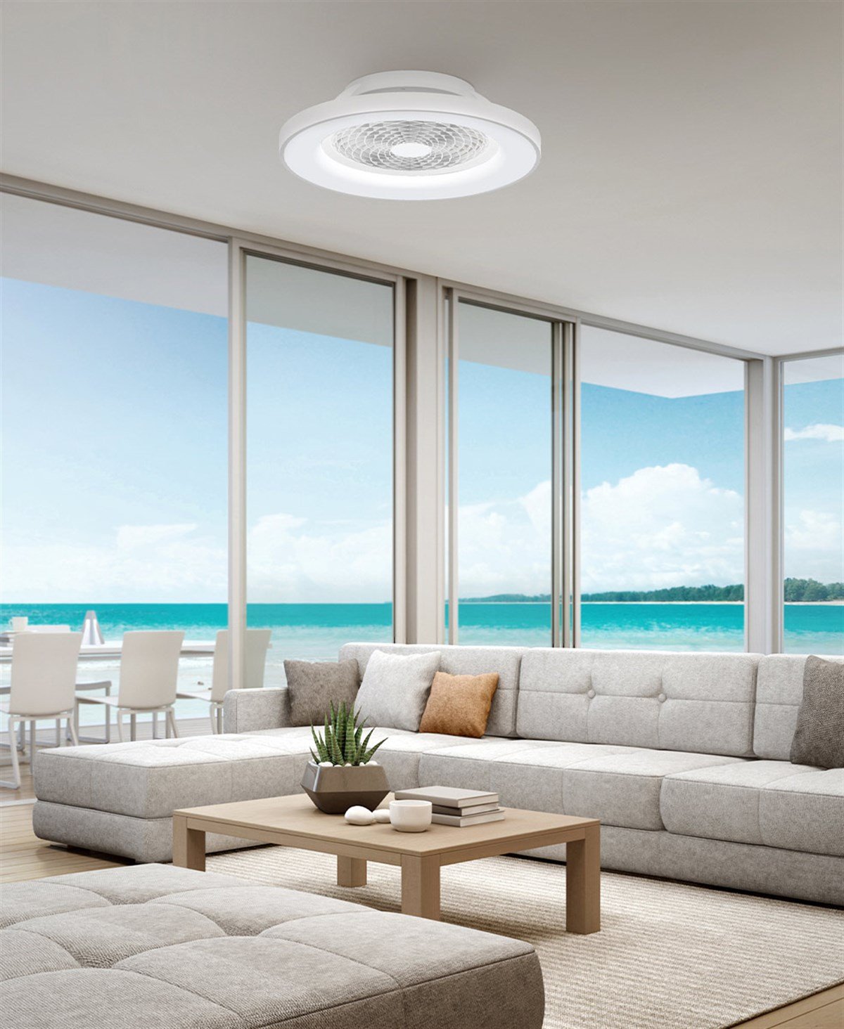 Dairesel bir şekilde küçültülmüş boyutu ile tavana monte edildiğinde odanın görüşünü engellemeyen, güvenli ve kolay bir şekilde takılan modern ve dekoratif bir tasarımdır.