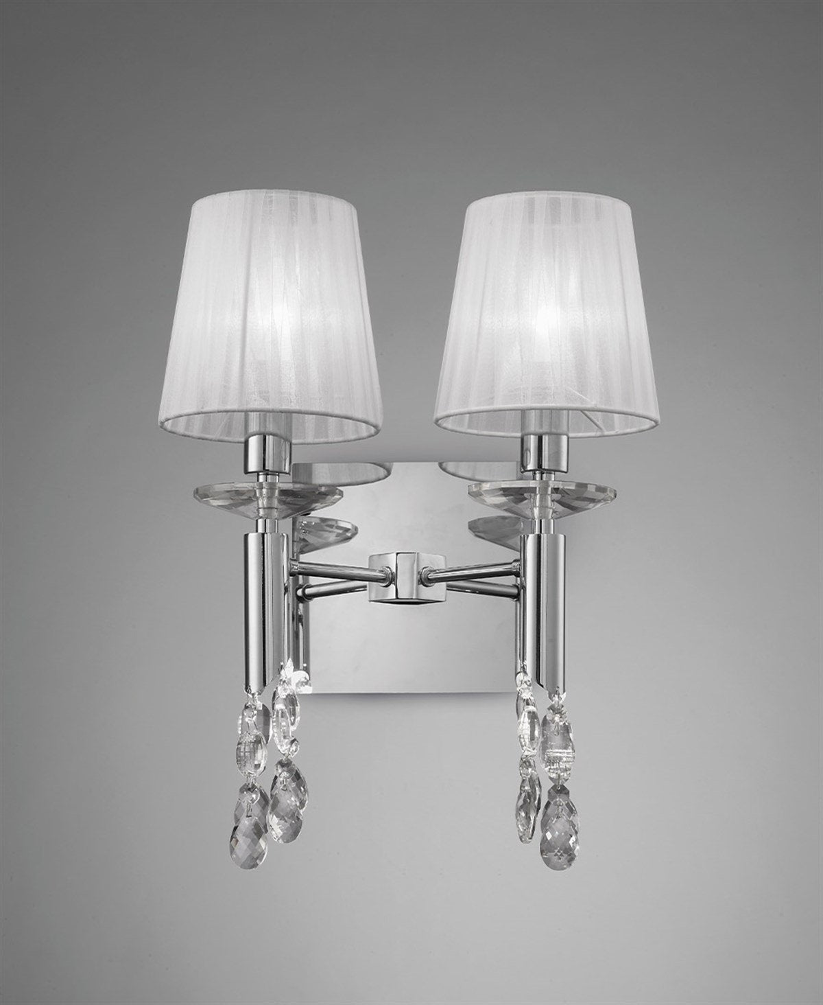 Krom metal Kumaş sarma şapka Şeffaf kristal Genişlik: 33 cm Duvardan mesafesi: 19 cm Yükseklik: 45 cm Ampul Adedi: 4 Ampul Gücü: 2 x 20 W + 2 x 5 W Ampul Türü: E14 + G9 Menşei İspanya Fiyatlarımıza ampul dahildir.