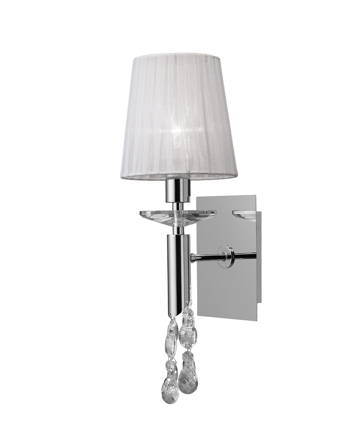Krom metal Kumaş sarma şapka Şeffaf kristal Genişlik: 12 cm Duvardan mesafesi: 19 cm Yükseklik: 45 cm Ampul Adedi: 2 Ampul Gücü: 1 x 20 W + 1 x 5 W Ampul Türü: E14 + G9 Menşei İspanya Fiyatlarımıza ampul dahildir.