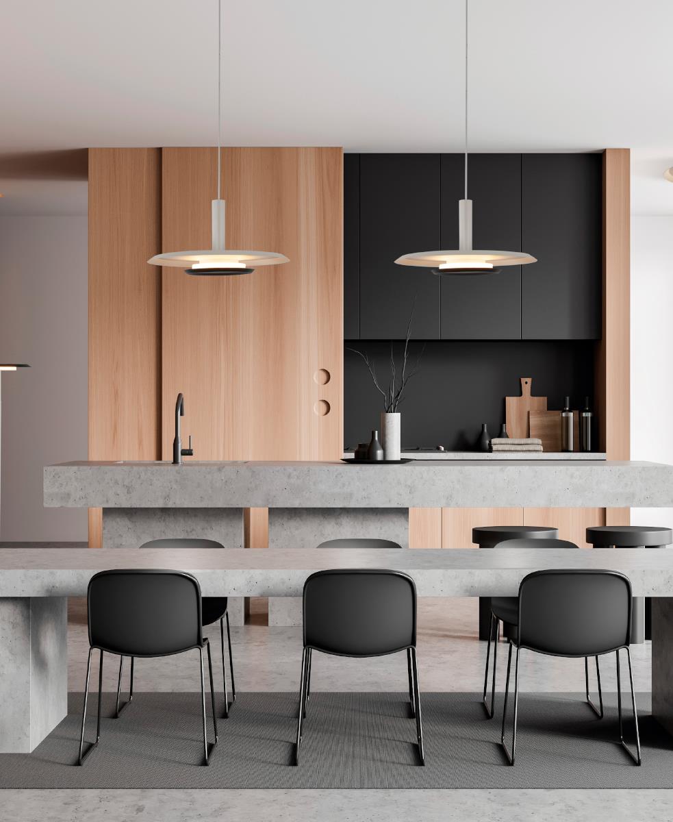 Mantra'nın LED sarkıt lambası Tina, modern bir tasarımın tüm özelliklerini, temiz ve zarif çizgilerle verimli işlevsellikle bir araya getiriyor.