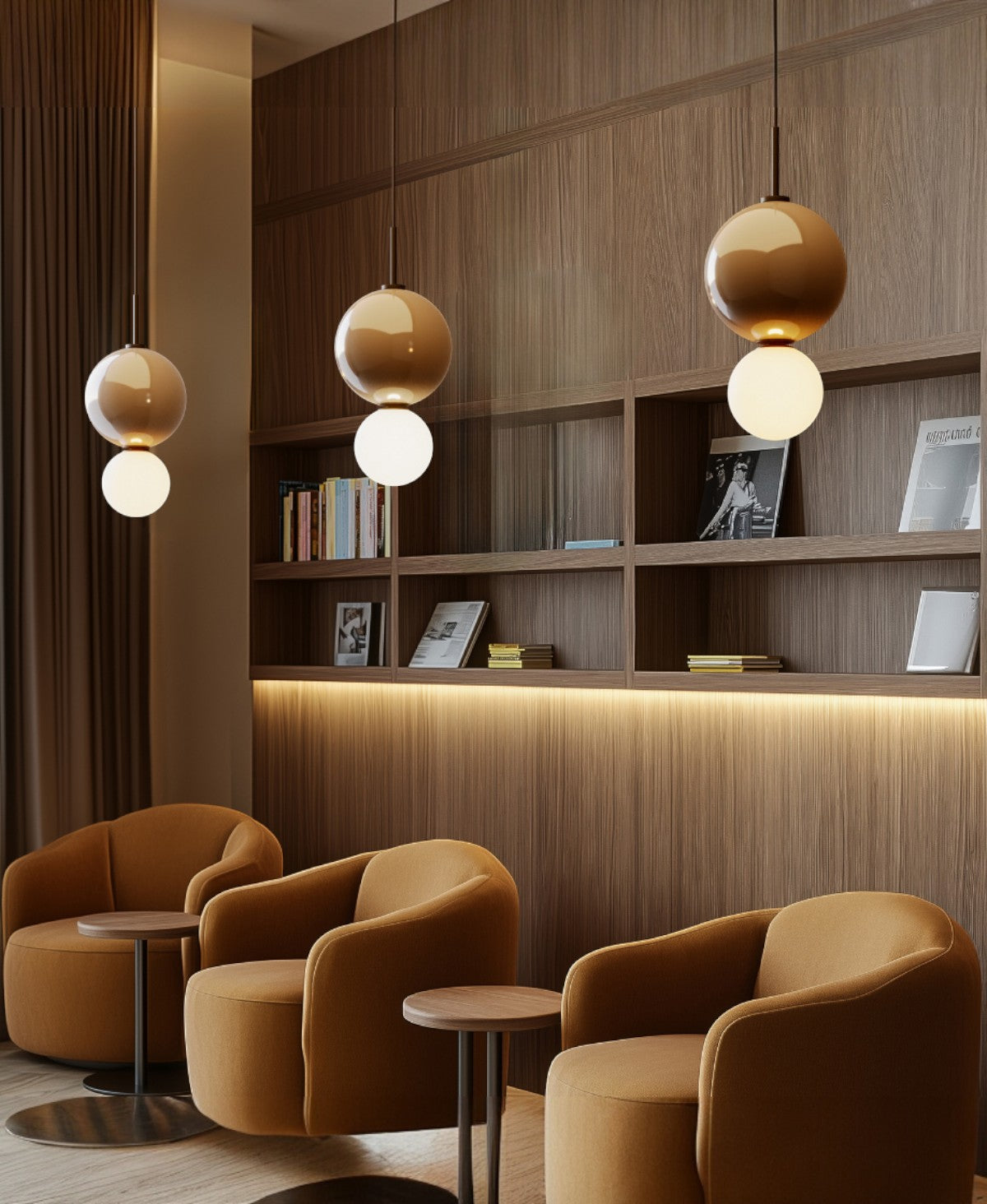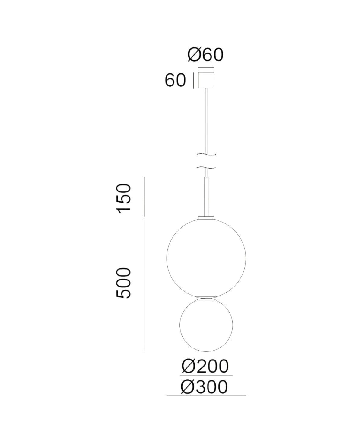Aydınlatma armatürünün gövdesi, Ø20 ve Ø30 cm çaplarında iki cam küreden oluşur, mat siyah metal detaylara sahiptir ve siyah tekstil kablo ile asılır.