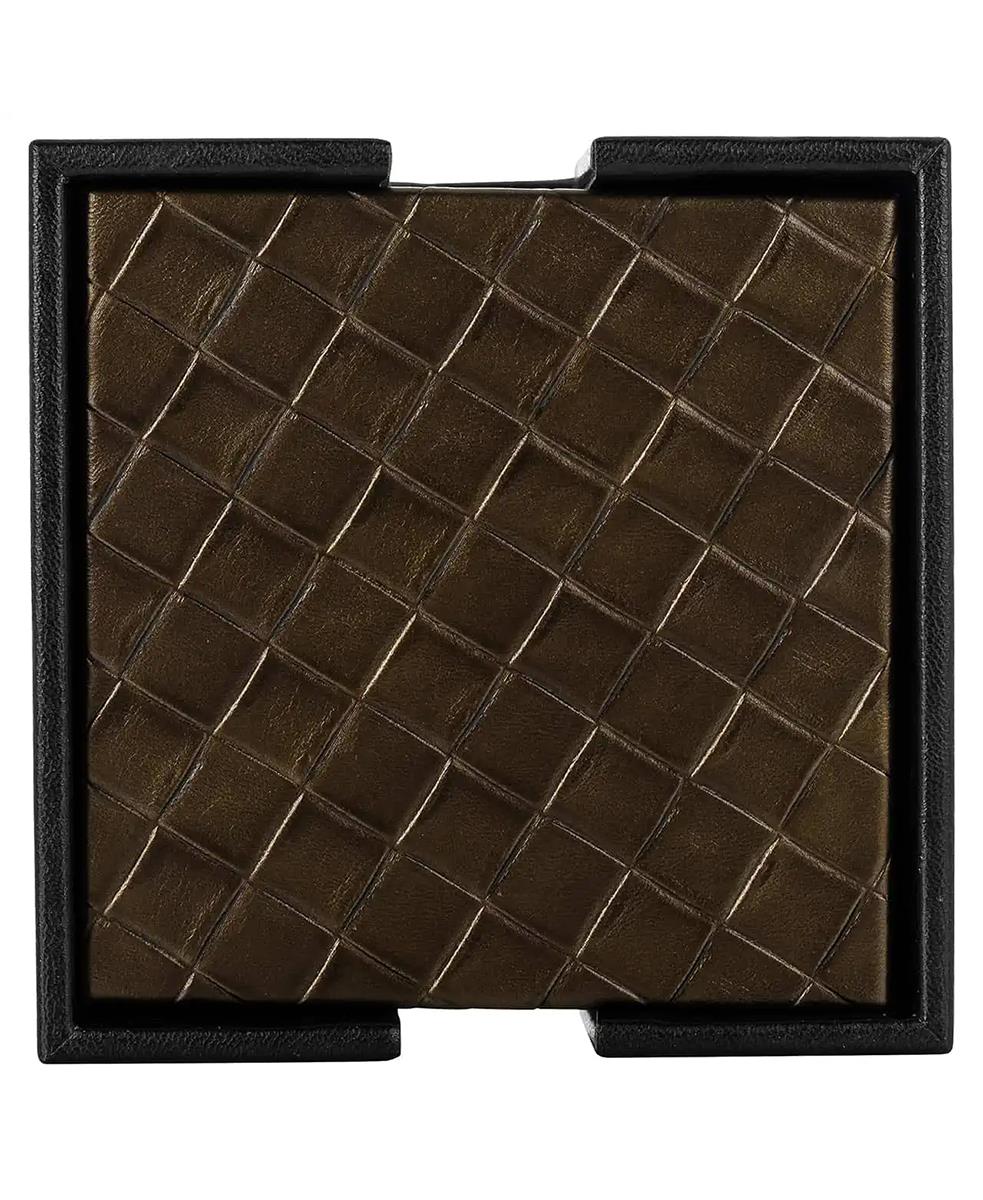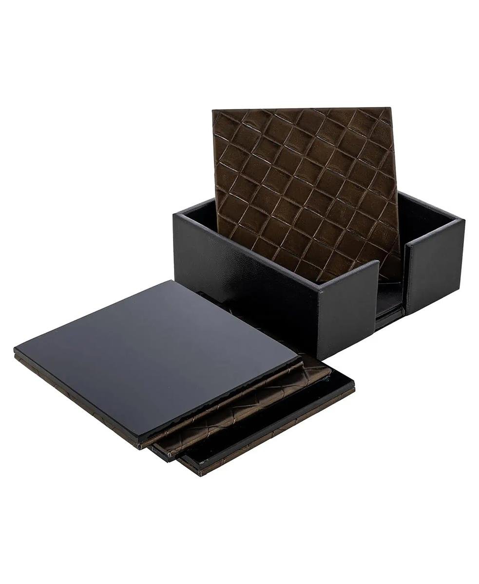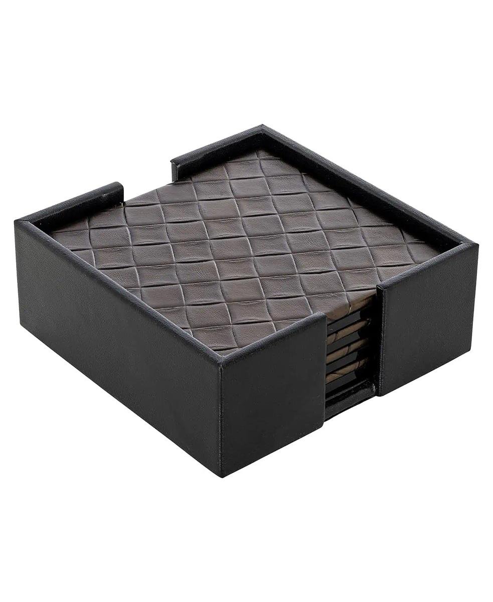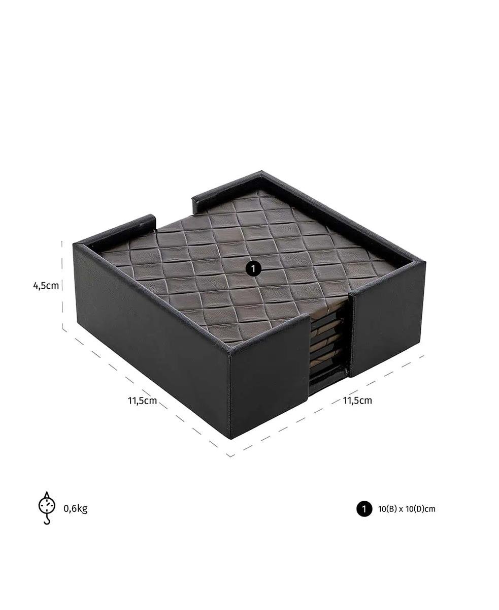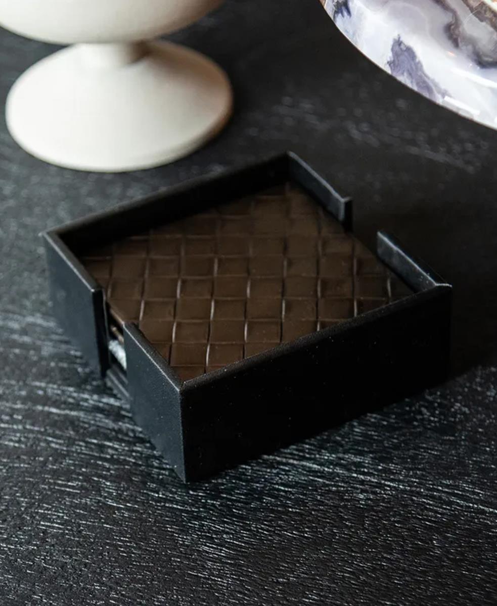 Yora bardak altlıkları suni deri ile birlikte ahşaptan yapılmıştır. Bardak altlıkları kare şeklindedir ve örgülü blok baskıya sahiptir.